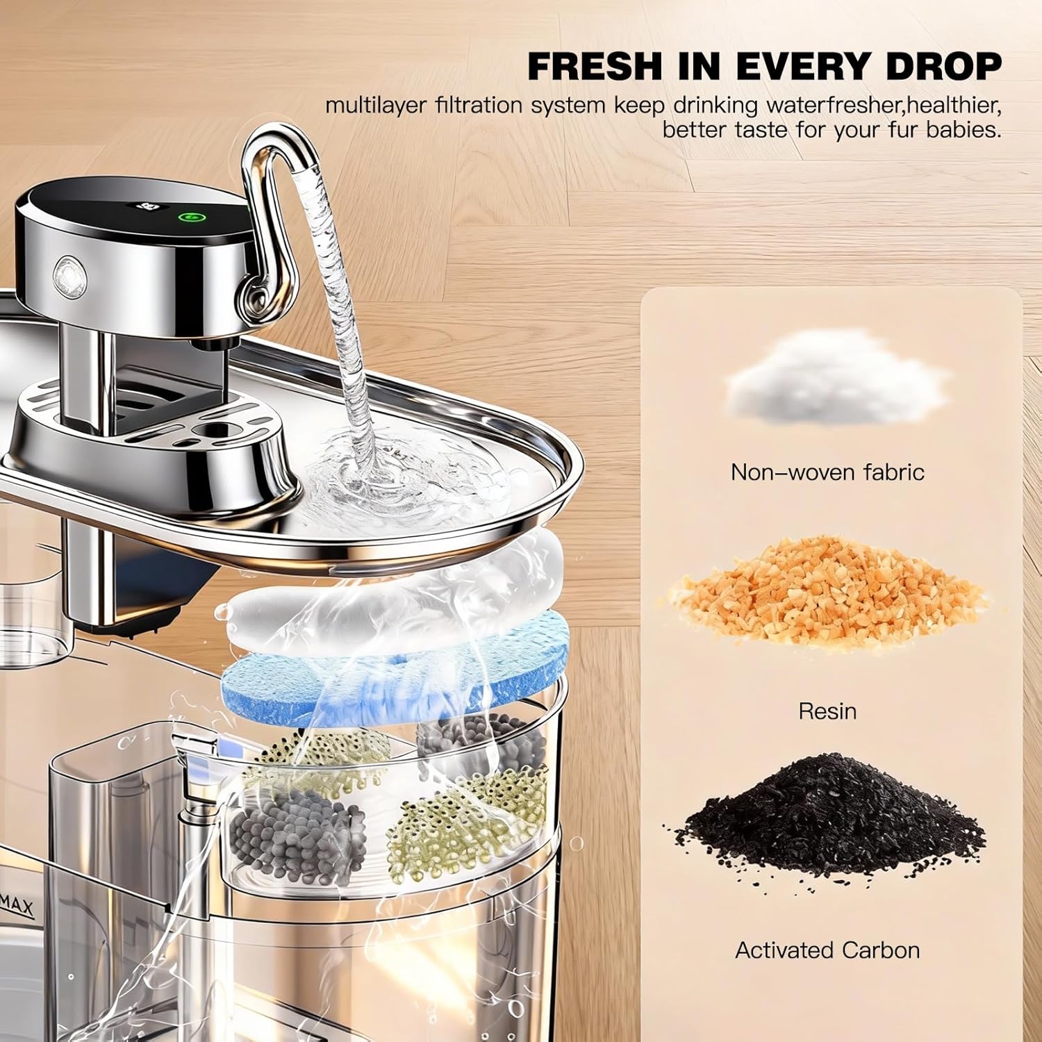 Give your pets continuous access to clean, filtered water with this 120oz / 3.5L stainless steel cat water fountain. Built with a durable 304 stainless steel top and an advanced multi-layer filtration system, it ensures fresh, great-tasting water every day. The ultra-quiet wireless pump operates below 20dB and features dry-run protection for safe and reliable performance. Its 180° motion-sensing technology automatically triggers water flow when pets approach, making hydration more interactive and energy-efficient. With dual flow modes—fountain and bubbling—pets can choose the drinking style they prefer. Powered by a long-lasting 5000mAh battery and designed with fully detachable components, this fountain is easy to clean and ideal for cats, puppies, seniors, or multi-pet households. Includes multiple filters, cleaning tools, instructions, and a durable color box for storage or gifting.
