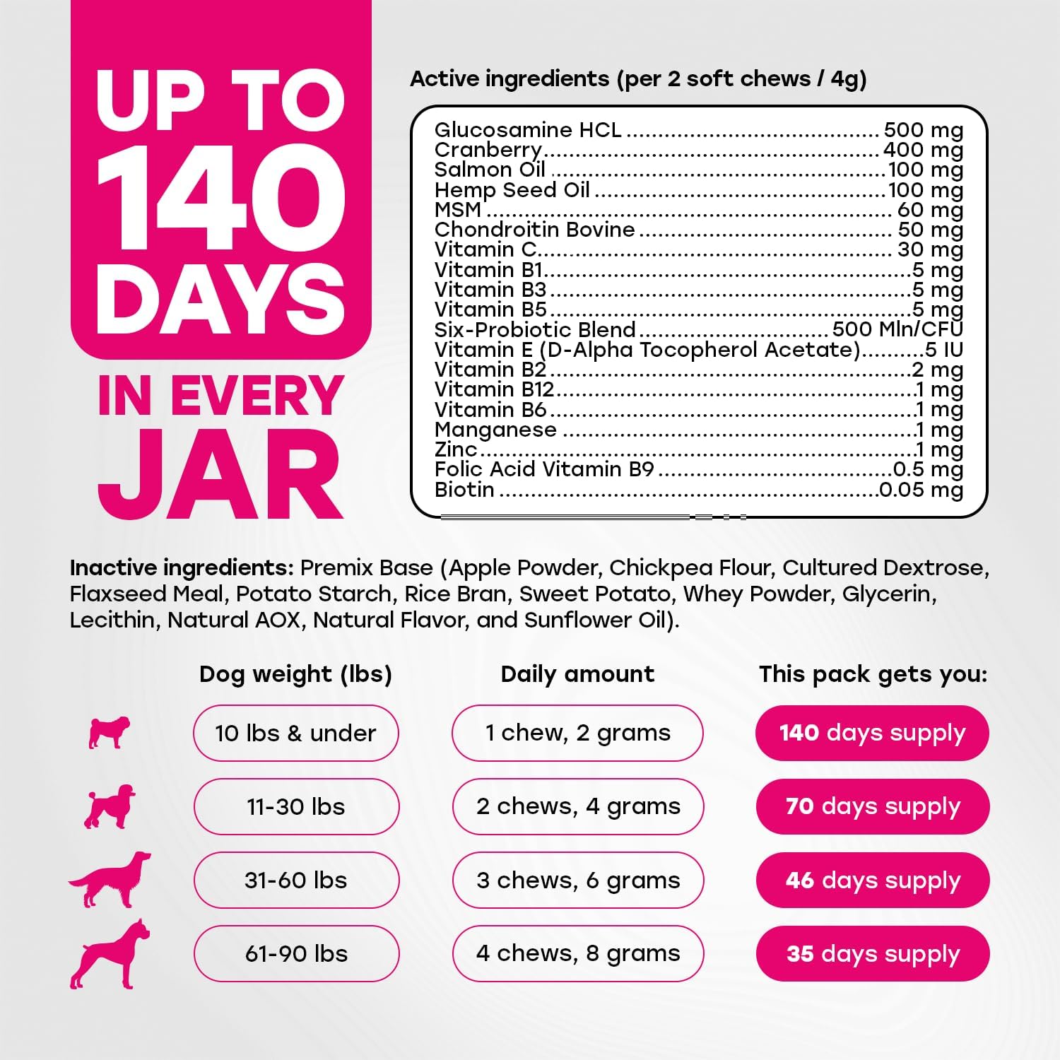 Stronger Joints & Mobility Support – Keep your dog running, jumping, and playing pain-free with the power of glucosamine! These soft chews support joint flexibility, cartilage health, and hip strength, making them ideal for active and senior dogs alike oxidative stress, protecting your dog’s skin and overall health while promoting resilience against environmental factors.