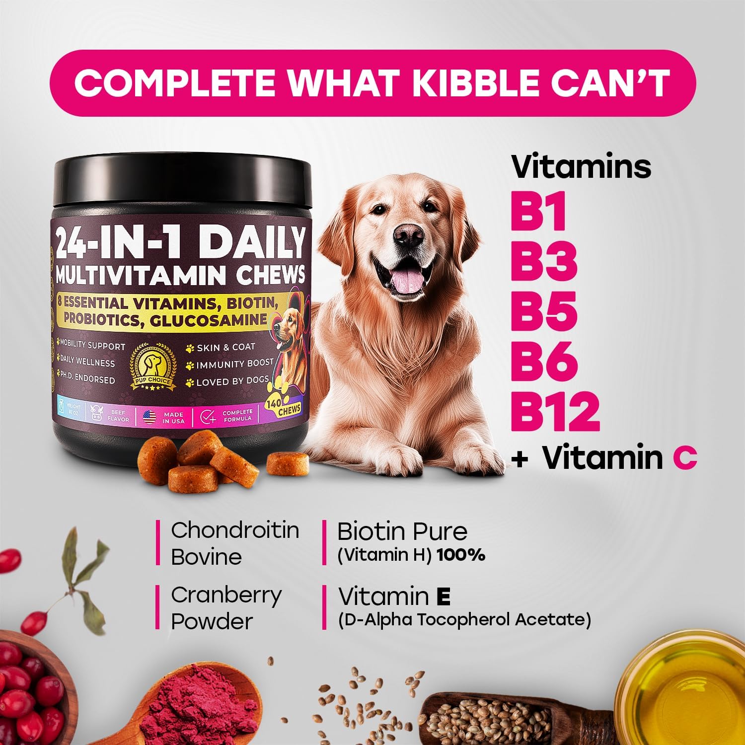 24-in-1 Complete Multivitamin Treats for Dogs – PhD Endorsed 8 Vitamins, Biotin, Probiotics, Glucosamine – Daily Wellness, Immunity, Skin & Coat, Mobility 140 Treats – Beef Flavor – Made in USA
