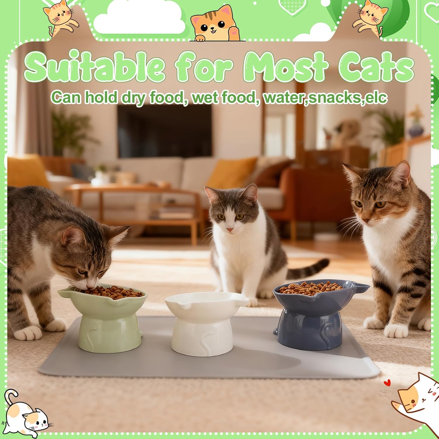 Material suitable size: Our cat food bowls elevated is made of plastic material, ensuring no harm to cats. these cute cat bowls are 13.5 cm/5.3 inch in diameter, with a base height of 8 cm/3.1 inch and a width of 11.5 cm/4.5 inch. the mat can accommodate three cat bowls at the same time without creating a mess