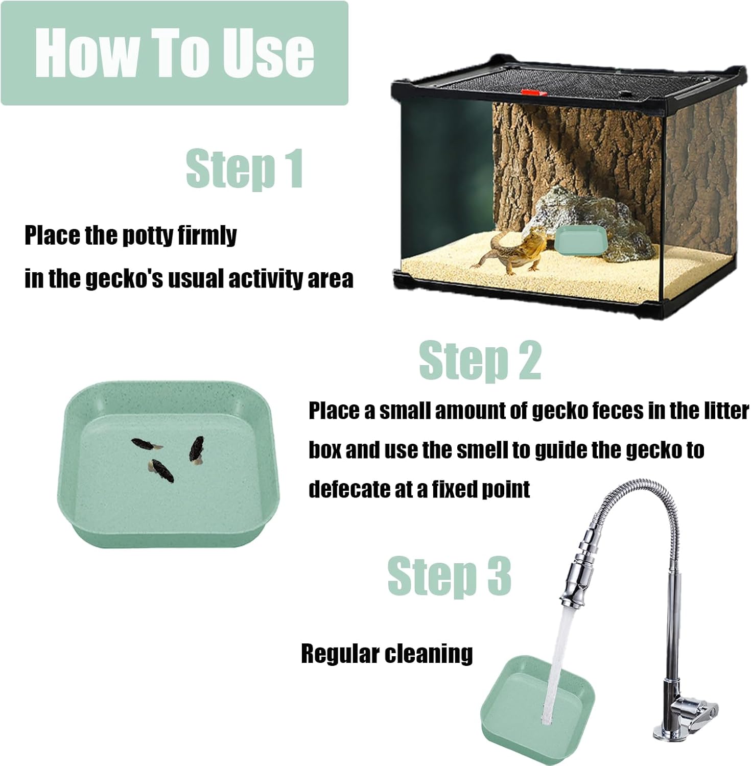 Instructions: Place the litter box firmly in the gecko’s usual area. Place a small amount of gecko feces in the litter box to encourage the gecko to develop a designated defecation spot using the scent. Remove the litter box regularly, discard the excrement, rinse with clean water, and return it to maintain a clean environment.