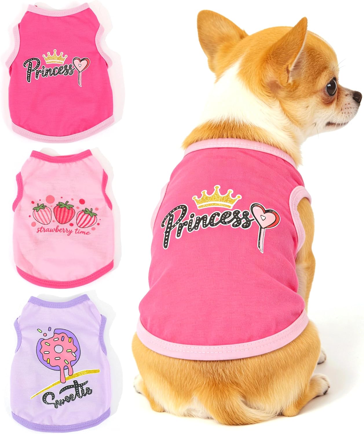 3 Styles Available: you will get 3 different styles of cute dog clothes, which are printed with letters and pattern, pink cartoon strawberry, purple sweet donuts and hot pink princess crown , providing multiple girl dog accessories outfit options for your small doggie to wear throughout the summer season