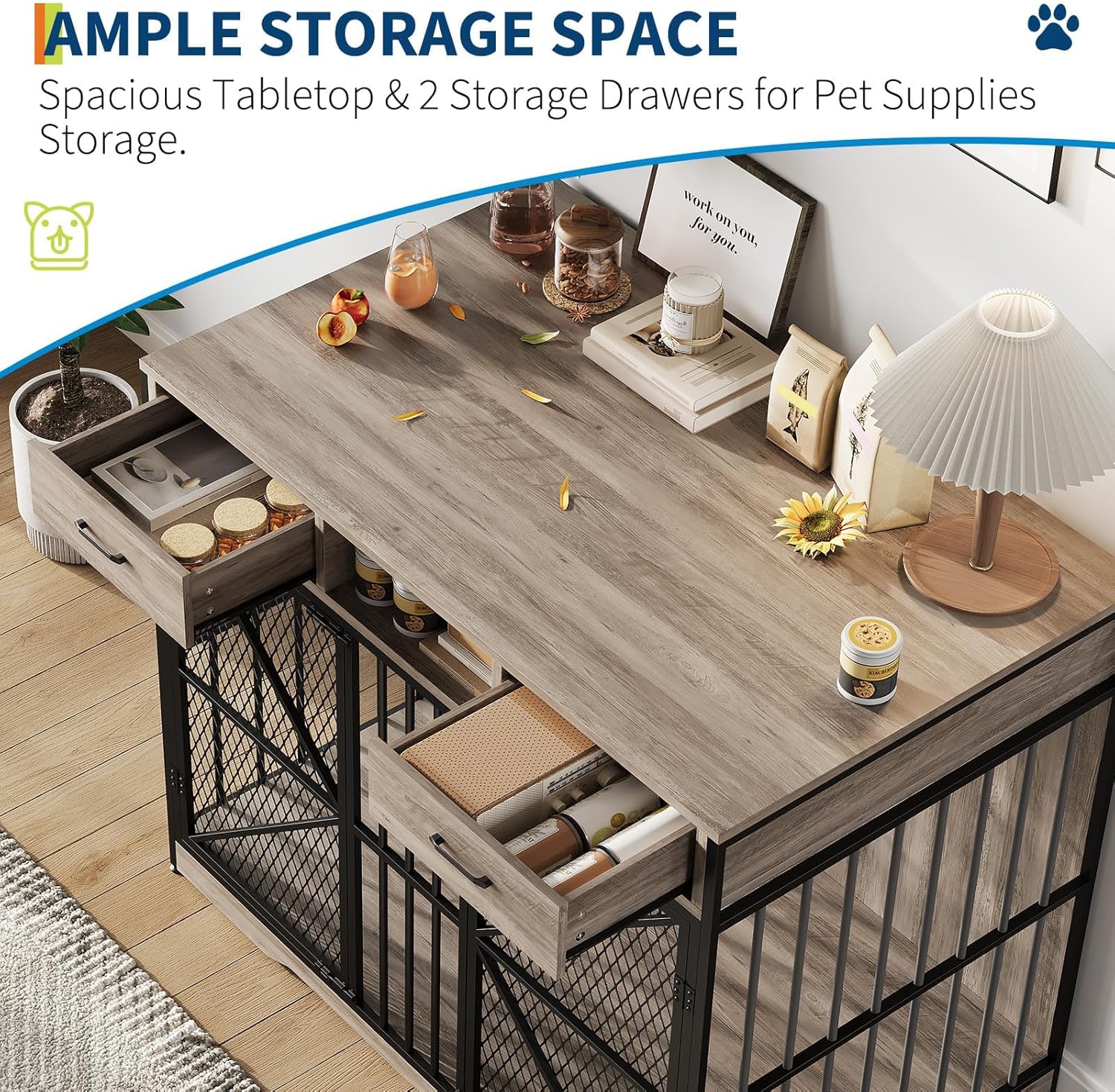 【Multi-Functional Dog Crate with Storage】This dog cage features built-in storage drawers and an open compartment, providing convenient space for pet toys, treats, and essentials. It functions as both a secure dog crate and a stylish end table, blending practicality with elegant design.