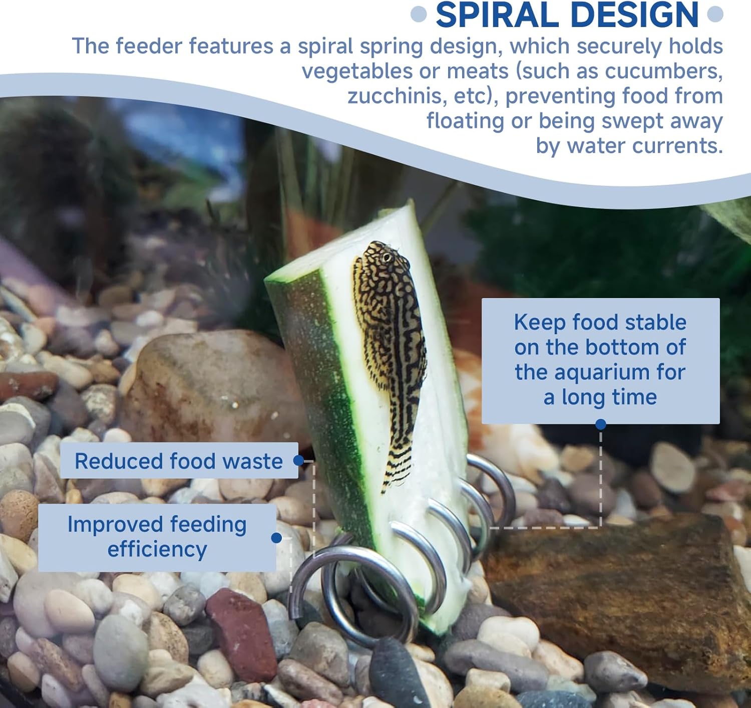 【Spiral Design】The feeder features a spiral spring design, which securely holds vegetables or meats (such as cucumbers, zucchinis, etc), preventing food from floating or being swept away by water currents. This not only reduces food waste but also helps keep food stable at the bottom of the aquarium for longer periods, improving feeding efficiency
