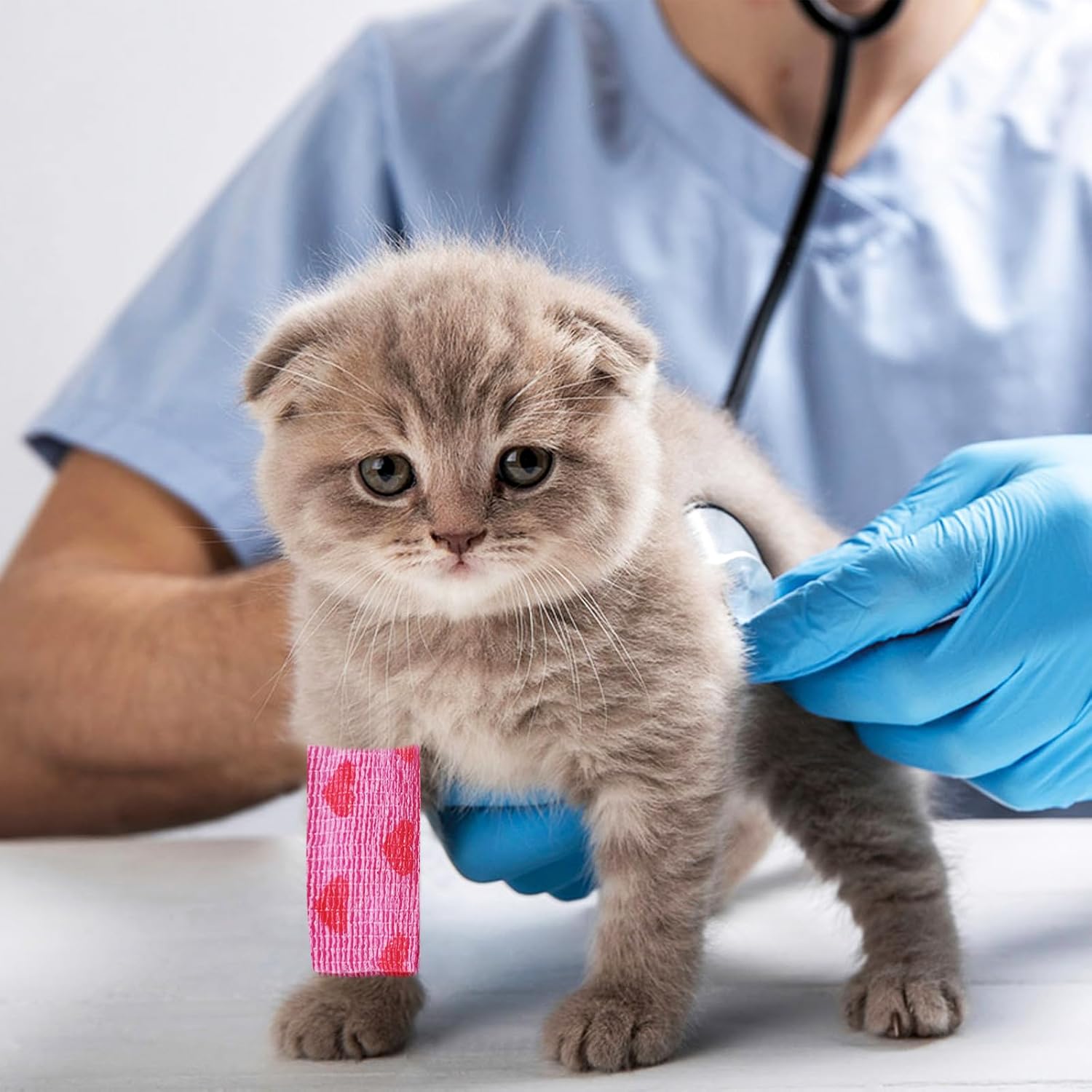 6 ROLLS 2 INCH X 5 YARDS PET VET WRAP SET: Each roll measures 2 inches wide and 5 yards long when fully stretched, offering generous length for everyday pet care. This 6-pack set includes a cheerful mix of heart and checkered designs in pink, white, green, blue, orange, and red—bringing both practicality and personality to your pet’s recovery routine.