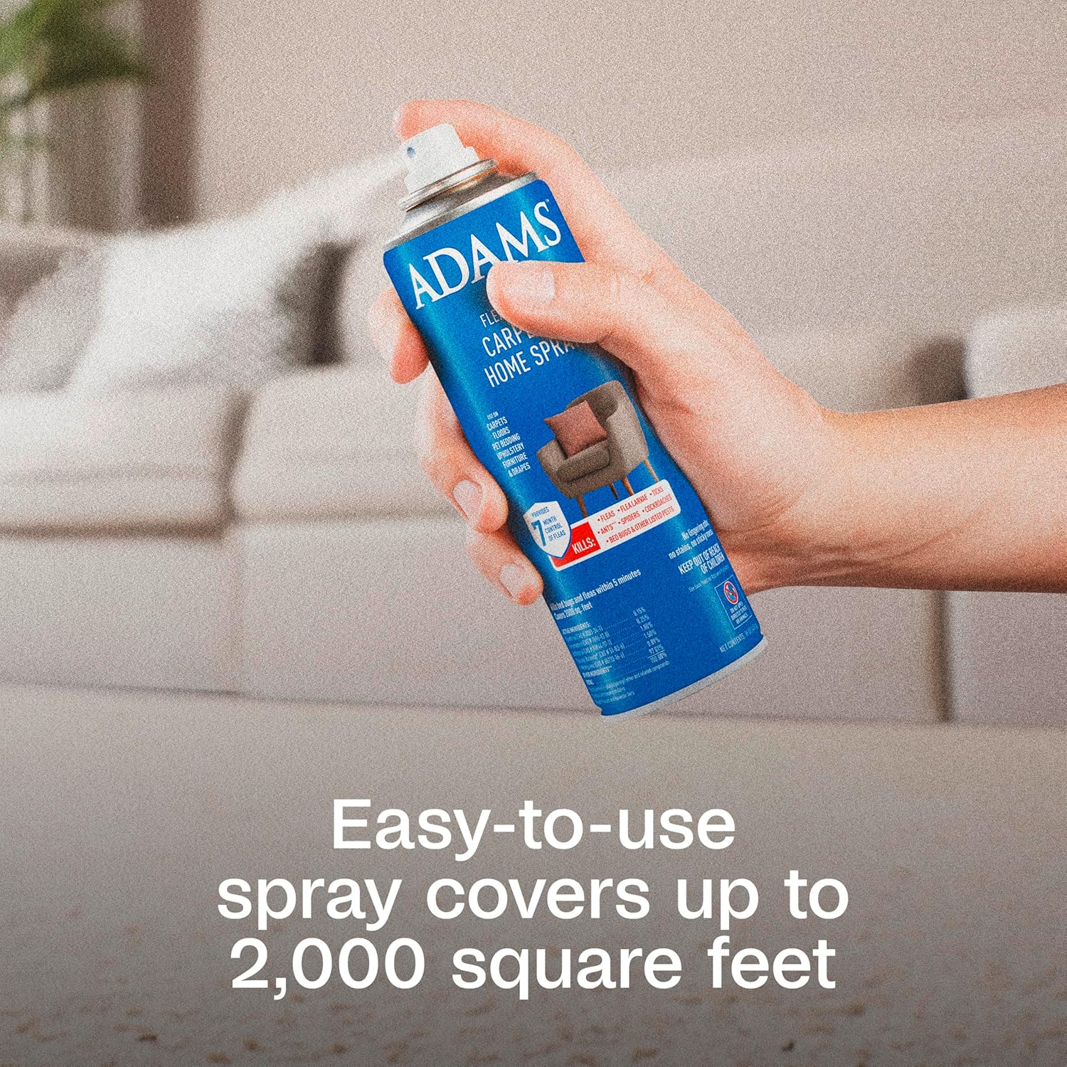 Protect your carpet from insect infestations. Fleas and ticks can find their way into your home and can hide in carpets, upholstery, pet bedding and more. Our carpet spray is non-staining and fragrance-free with no lingering chemical odor. Adams Plus Flea & Tick Carpet Spray provides up to 7 months of protection indoors and kills fleas, flea eggs, flea larvae,, ticks, roaches, ants, spiders, silverfish, and many other labeled insects *(*when applied at the maximum label rate). One can will treat up to 2000 square feet. With 5% of fleas living on your pet and the remaining 95% living in your home or yard, Adams products are designed to provide you with the power to prevent pests on every front. To complete your flea and tick control system try one of the many Adams flea and tick collars designed specifically for your dog, puppy, cat, or kitten. Also try Adams Yard & Garden Spray, designed to use outside in your yard.