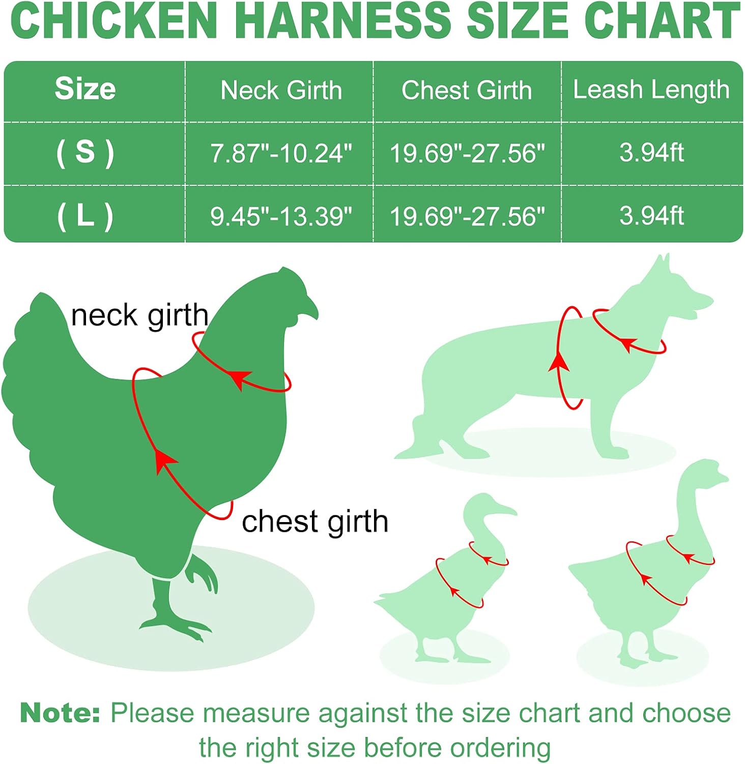 Bought this chicken harness for my house chicken. When I first put it in her she laid down. After a few times if putting it on her and standing her up she started walking. Now I can take her anywhere for walks. It fit her perfectly and made of top quality material. A definite buy for a pet chicken you can take anywhere.