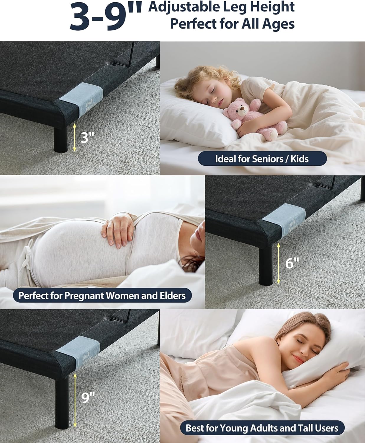 SUITABLE HEAD AND FOOT INCLINE:-After many adjustments, the electric bed frame with the head elevated 0 to 60° and the foot elevated 0 to 40° conforms to all sleeping positions, such as lying down, half-sitting, half-reclining, fully sitting up, etc. Ideal for people who suffer from snoring, back or joint pain and mobility issues