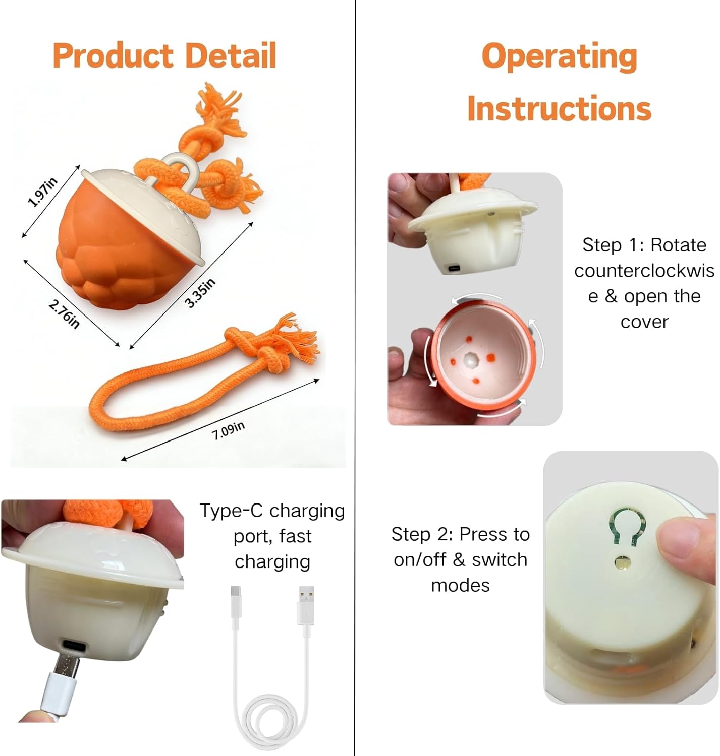 【USB-C Rechargeable & Durable Build】 Featuring a built-in rechargeable battery with convenient USB-C charging, it eliminates the cost and waste of disposable batteries. Made from pet-safe, chew-resistant materials, the sturdy outer shell and rope are designed to withstand enthusiastic playtime with small to medium dogs.