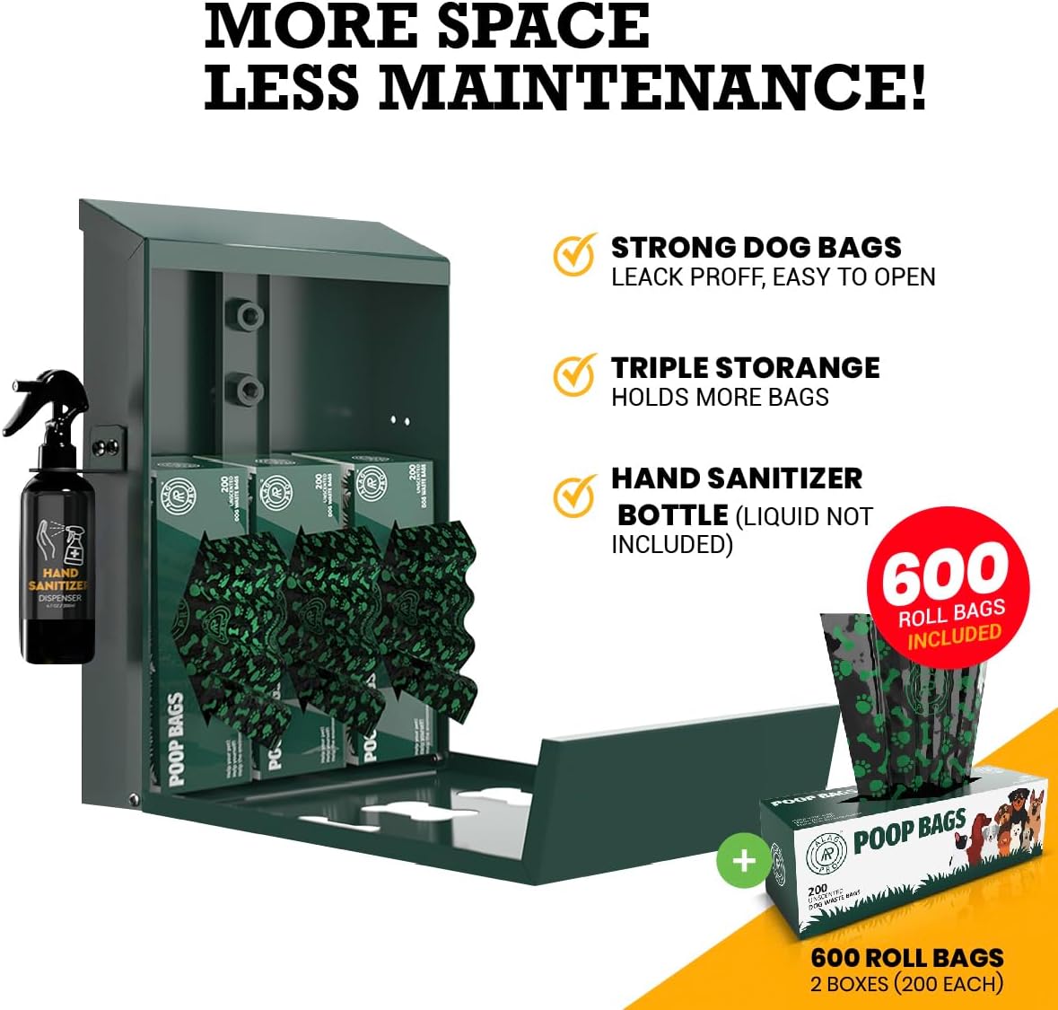 The triple storage holds more bags at once, less refills and maintenance. Doesn’t rust and fade, you will have years of use!