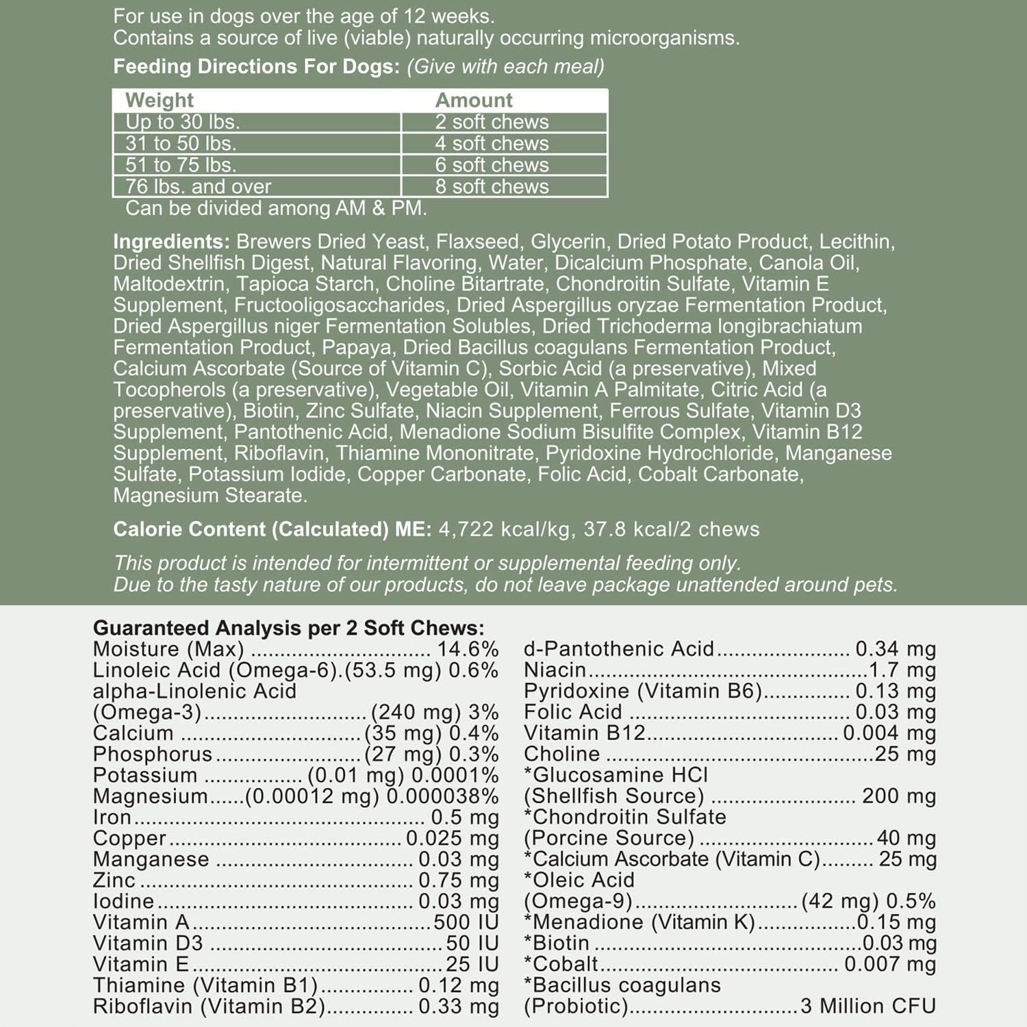 This 4-in-1 product makes providing my dog with excellent quality supplementation very easy. She seems to love the taste, and they contain ingredients that provide her with a great foundation for a healthy life. I definitely recommend these.