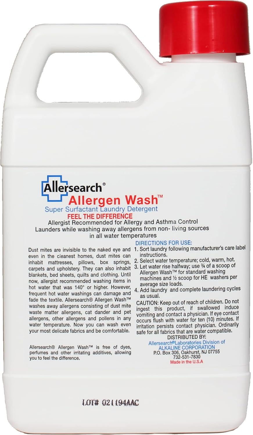 Allergen Wash is a super surfactant concentrated laundry detergent that works in cold, warm, and hot temperatures. It is a complete detergent that launders fabrics while washing away allergens such as dust and mite waste matter, pollen and pet dander.