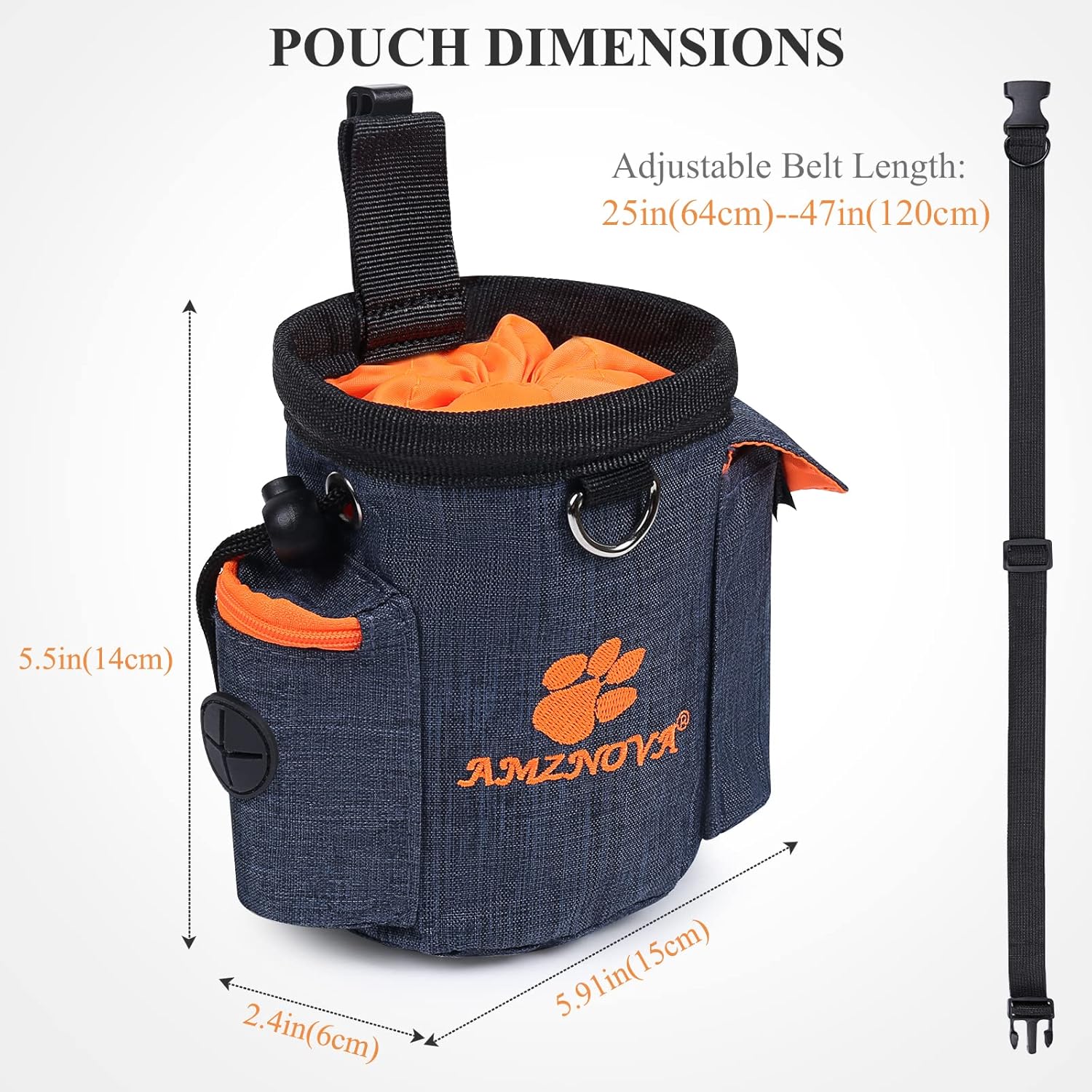 Free Your Hands: Two ways to carry, Adjustable waistband (25.2ā~47.2ā) makes the treat pouch attached securely around your waist, Strong belt clip makes this treat pouch easily hook on your belt, no worry about falling off on outdoor activity. And the D-ring is designed to hold dog whistle and trainer, enables outside training easier