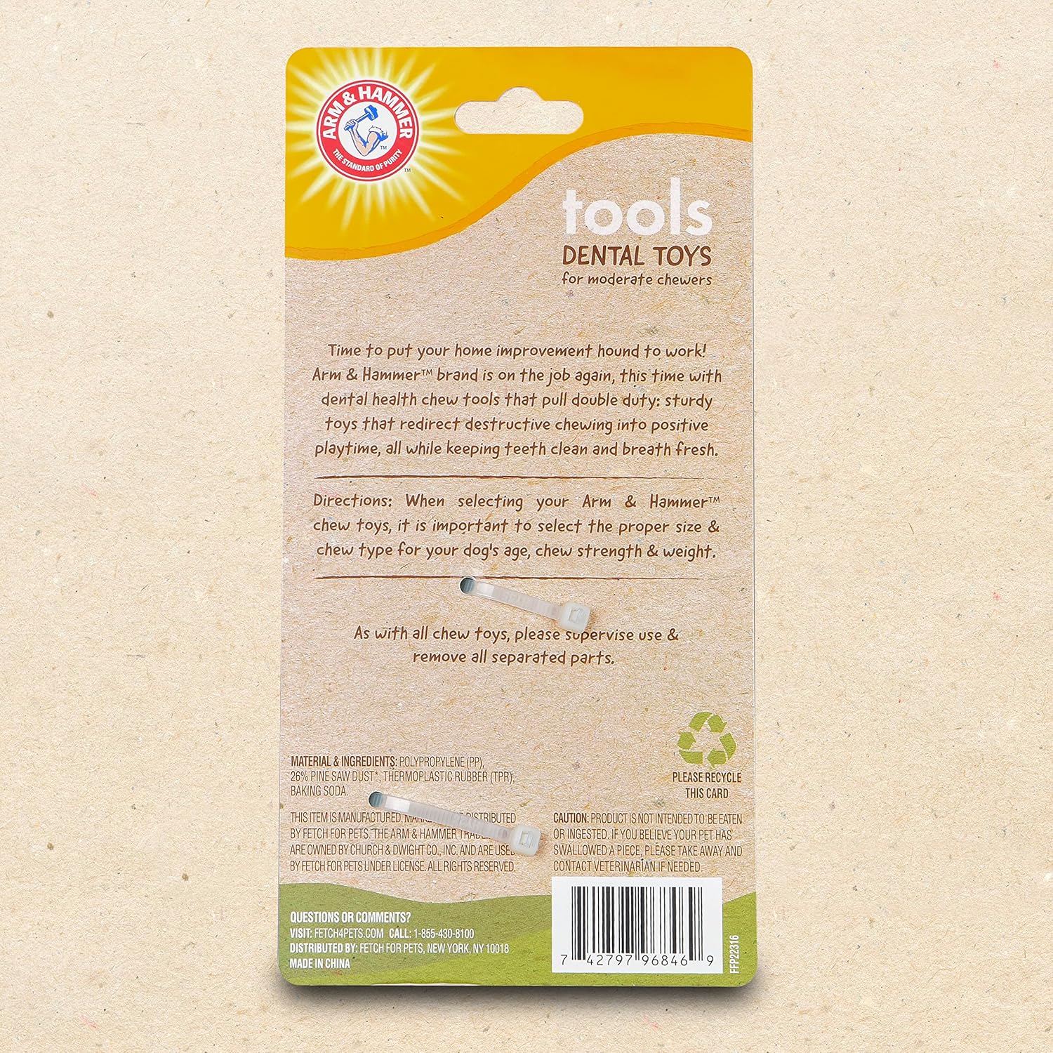 Hire your pup to help with your next home improvement project! With the Arm & Hammer™ Tools: Pliers Dog Chew Toy, you can equip your training toolbox with a toy that helps redirect destructive chewing into positive playtime. Only Arm & Hammer™ could deliver a tool that serves up double-duty as both a fun toy and a healthy dental chew. Made from blended and compressed natural wood fiber with synthetic material, this chew toy replicates the sensory experience dogs love about chewing wood, but in a safer and sturdier chew toy. Additionally, this dog chew is infused with signature Arm & Hammer™ Baking Soda. Baking soda helps absorb bad odor and has been shown to contribute to whitening teeth. Collect the whole tool set from Arm & Hammer™, each with an easy-to-grip shape for hours of easy chewing, durable nubs and grooves to help clean teeth and massage gums, and signature Arm & Hammer™ Baking Soda to. This is a more durable and safer alternative dog chew toy that is designed for dogs to enjoy chewing for hours, while the durable TPR spikes help clean teeth and massage gums. Plus, eco-friendly packaging and recyclable materials support Arm & Hammer™’s mission to offer versatile, effective, environmentally safe, and economical pet health products. When selecting your Arm & Hammer™ chew toys, select the proper size & chew type for your dog’s age, chew strength, & weight. Please supervise use & remove all separated parts. Product is not intended to be eaten or ingested. Arm & Hammer™ is the trusted name in gentle, yet effective cleaning for over the past 100 years. Now Arm & Hammer™ for Pets brings those same cleaning methods to our companion animals, becoming a leading dental brand in the pet space with a wide variety of products aiming to make it easier for pet parents to care for their canine companions. Check out our full line of Arm & Hammer™ for Pets products that offer an easy way for pet parents to find dental health solutions that work.