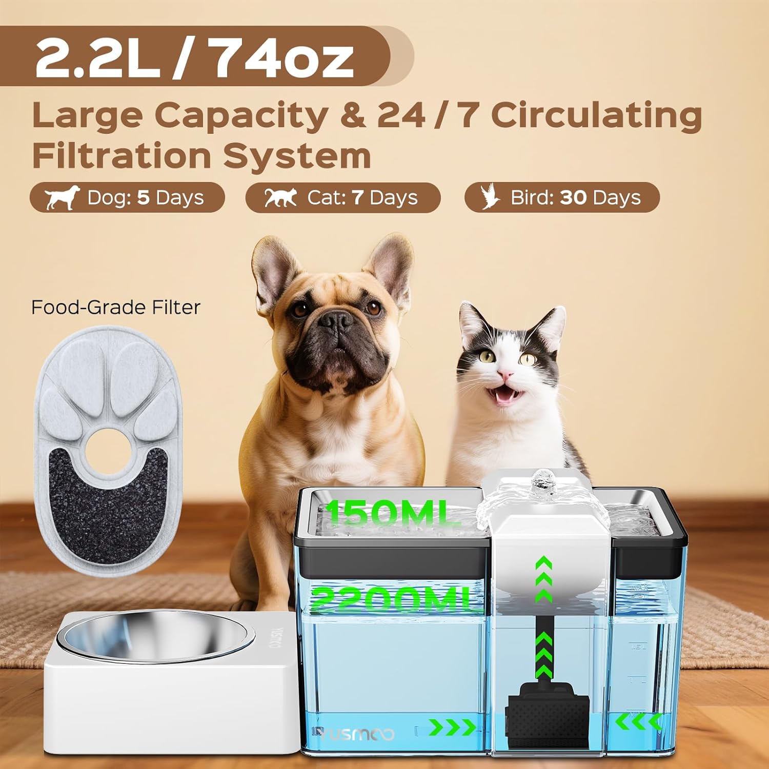 Automatic Cat Water Fountain with Food Bowl – 2.2L/74oz 2-in-1 Pet Water Dispenser & 304 Stainless Steel Bowl, Ultra-Quiet, LED Indicator, BPA-Free, Smart Shut-Off for Cats and Dogs