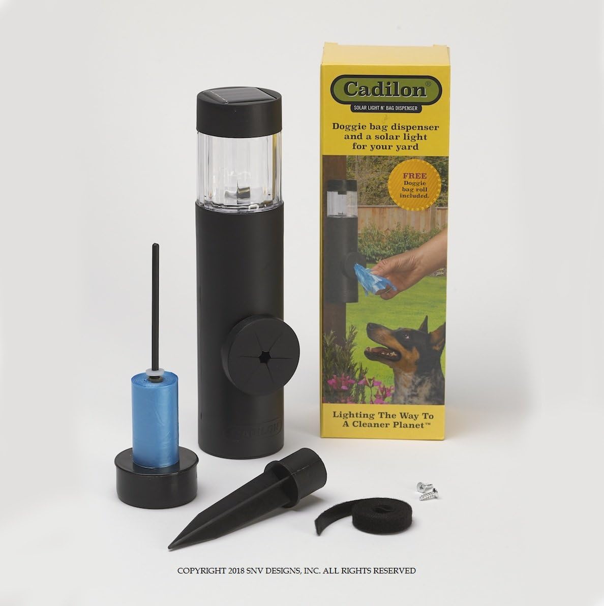 CADILON was originally featured in the 2016 people magazine holiday gift guide for pet lovers. This updated version of the CADILON has a transparent lens , an on/off switch for the LED light, a longer velcro strap to facilitate mounting around post and fences . The CADILON is a convenient device for front, backyards, store fronts, and camping trips. The solar light is ready to use, just put the switch in the “on” position. The battery within the unit charges during the day when placed in direct sunlight and the LED light turns on after dark. It is lightweight yet sturdy, convenient to move around, and refilling the CADILON with a doggie waste bag roll is a snap. Each CADILON unit comes with one roll of 15 doggie waste bags (color of bags will vary).