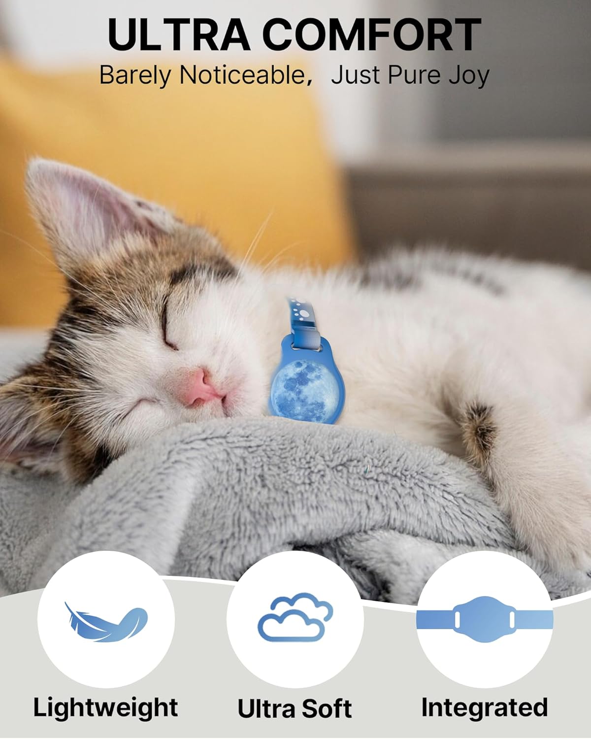 Super easy to set up! The tag just pops in and out of the collar, and powering it on/off is as simple as holding the button until it chimes. It connected to Find My iPhone right away and shows up reliably, which gives me peace of mind if my cat gets out. The collar itself is comfy and lightweight, my cat doesn’t mind wearing it at all. Cute design too (love the moon print!).