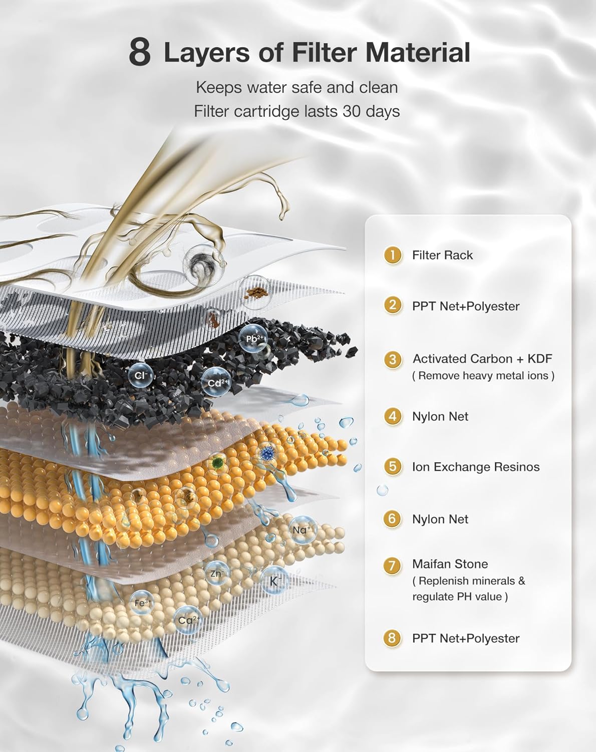 Flowing Pure and Fresh Water: Experience the benefits of our advanced 8-layer filtration system. Combining activated carbon, ion exchange resin, mineral ceramic balls, and unique KDF material, our dog water fountain effectively removes impurities, softens water, and eliminates odors. The filter element can be used for about 30 days, depending on usage. Petgugu app conveniently alerts you when it’s time for a replacement