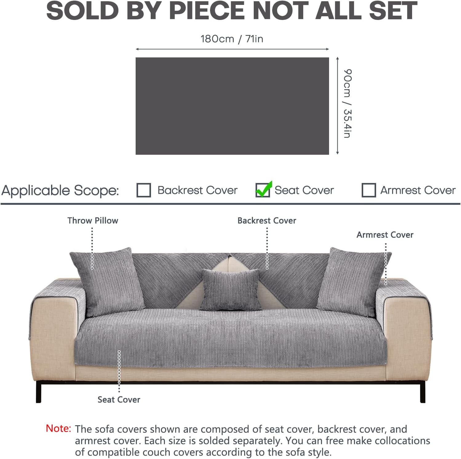 【Sold By Piece Not Set】Sold as 1 PIECE, Not all Set. For full coverage, you need buy seat cover + armrest covers + backrest covers. Measure your sofa before purchase. Color may vary slightly due to screen settings.