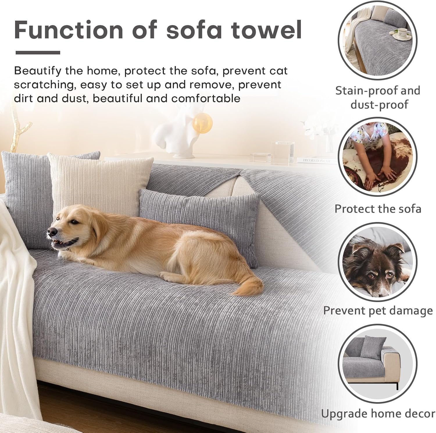 【Ultra-Soft & Pet-Friendly Chenille Fabric】Made from premium chenille material, this couch cover for dogs provides a plush, skin-friendly surface for both you and your pet. The elegant vertical stripe design enhances your home décor while offering a cozy resting spot.