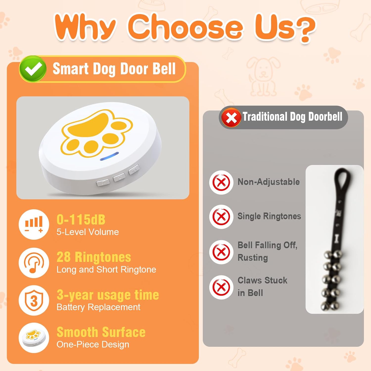 🔊 Adjustable Volume (0-115 dB) – Low volume for apartments or high volume for large homes. Never miss a ring with these dog training bells for door, ensuring your pup’s signals are always heard!