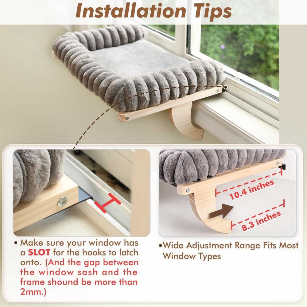 【No Suction Cups & Drilling Required Installation】Anchor into the window slot by two metal hooks and brace firmly against the wall by the brackets, our cat window sill perch is a extra stable lounging spot for pets without any dropping risk from suction cups and wall damage from drilling. Please make sure there is a SLOT of your window for the hooks to anchor into before purchasing!