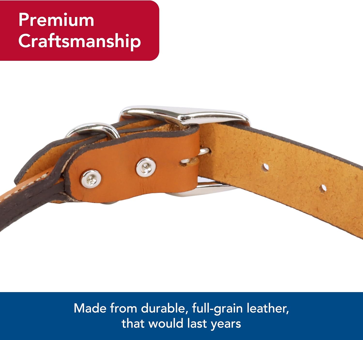 We were looking for a well made collar for our Shih Tzu and this had many good advertising points… handmade, rounded for comfort, etc. Upon its arrival, attached to it was a disclaimer/ warning tag saying it can expose you to nickel, lead, etc. When rubbed with a cloth, it leaves a black mark. We thought a natural leather collar would be safer than a synthetic one…disappointed that this was not posted on the website… now I’m looking for a replacement