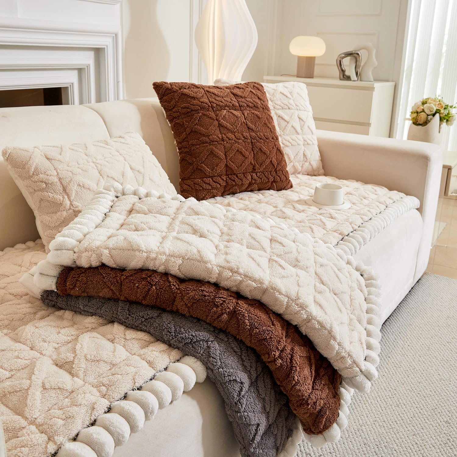 This couch cover is even prettier than it looks in the photos! It’s super soft, fluffy, and feels so cozy to sit on. The texture is really nice and makes the sofa feel extra comfortable. One thing that’s a little different from the pictures — the black lines are more noticeable, while they don’t really show up much in the photos. Still, I’m very happy with this purchase and plan to buy more. Highly recommend!