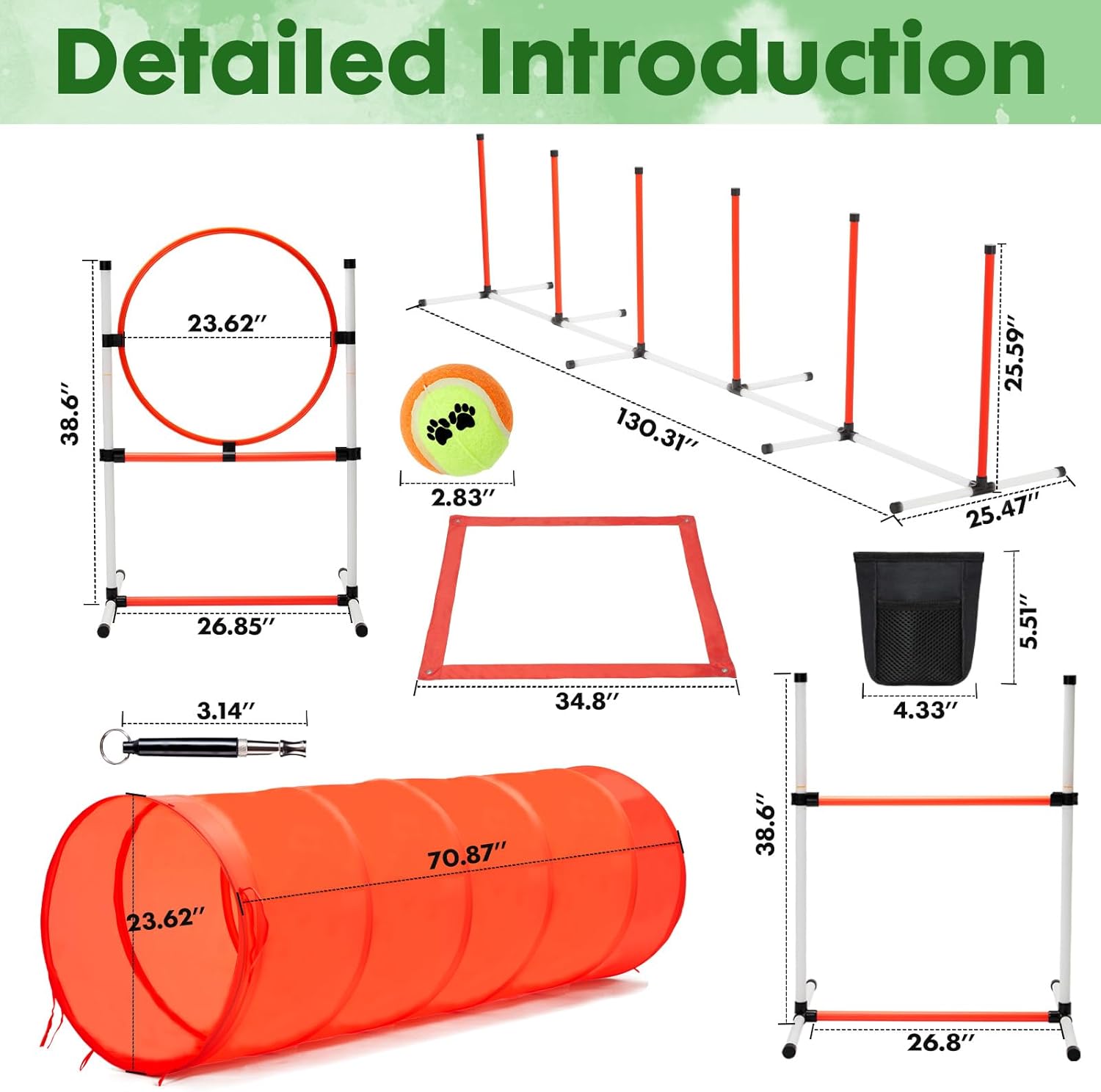 【Complete Agility Training Kit】It includes : 2 adjustable jump hurdles,jump ring, dual modes weave poles(used on grass and hard surface),1 tunnel and 1pause box,a dog treat pouch and 2 toy balls.Suitable for (small/ Medium/ large) dogs of any age!