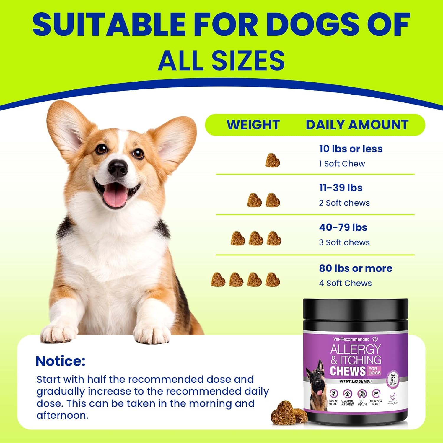 More convenient and efficient package:200ct(4x50ct)allergy and itch relief for dogs offers more flexible and portable storage,ideal for owners who travel frequently,move.It reduces dog itch relief products the risk of waste,allowing for faster use after opening and minimizing allergy dog chews spoilage due to long-term storage.Itchy skin relief for dog suitable for multi-pet owners,each bottle itchy dog can be used for different dogs,avoid cross-infection caused by frequent opening allergy chews