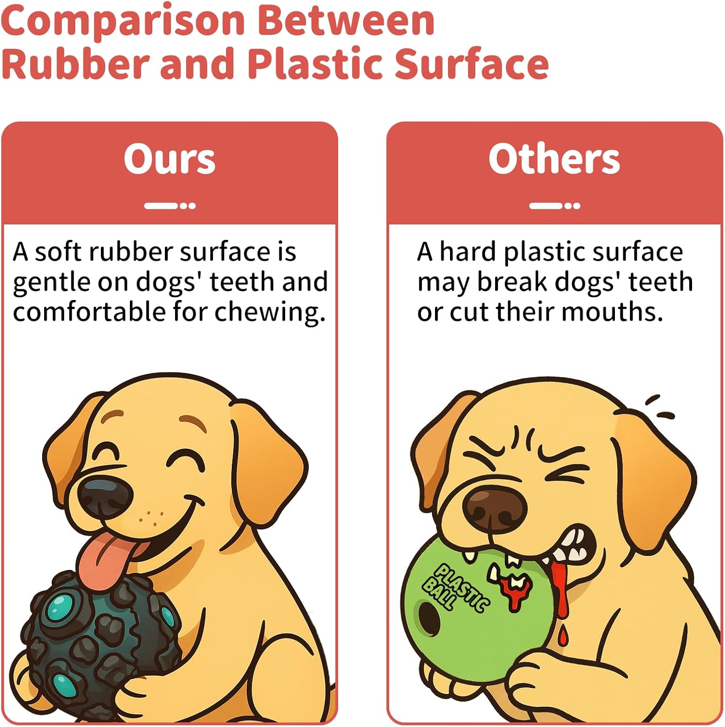 Teeth Cleaning for Large Dogs – The outer rubber surface is durable yet remains soft and gentle on dogs’ teeth and comfortable for chewing. By comparison, some popular squeaky balls use hard plastic surfaces, which may break dogs’ teeth or cut their mouths. Our squeaky ball features meteorite-shaped nubs on its rubber surface, designed to help clean teeth and remove food stuck. You can also apply toothpaste on the JoyBruko dog ball to help furries keep dental health!
