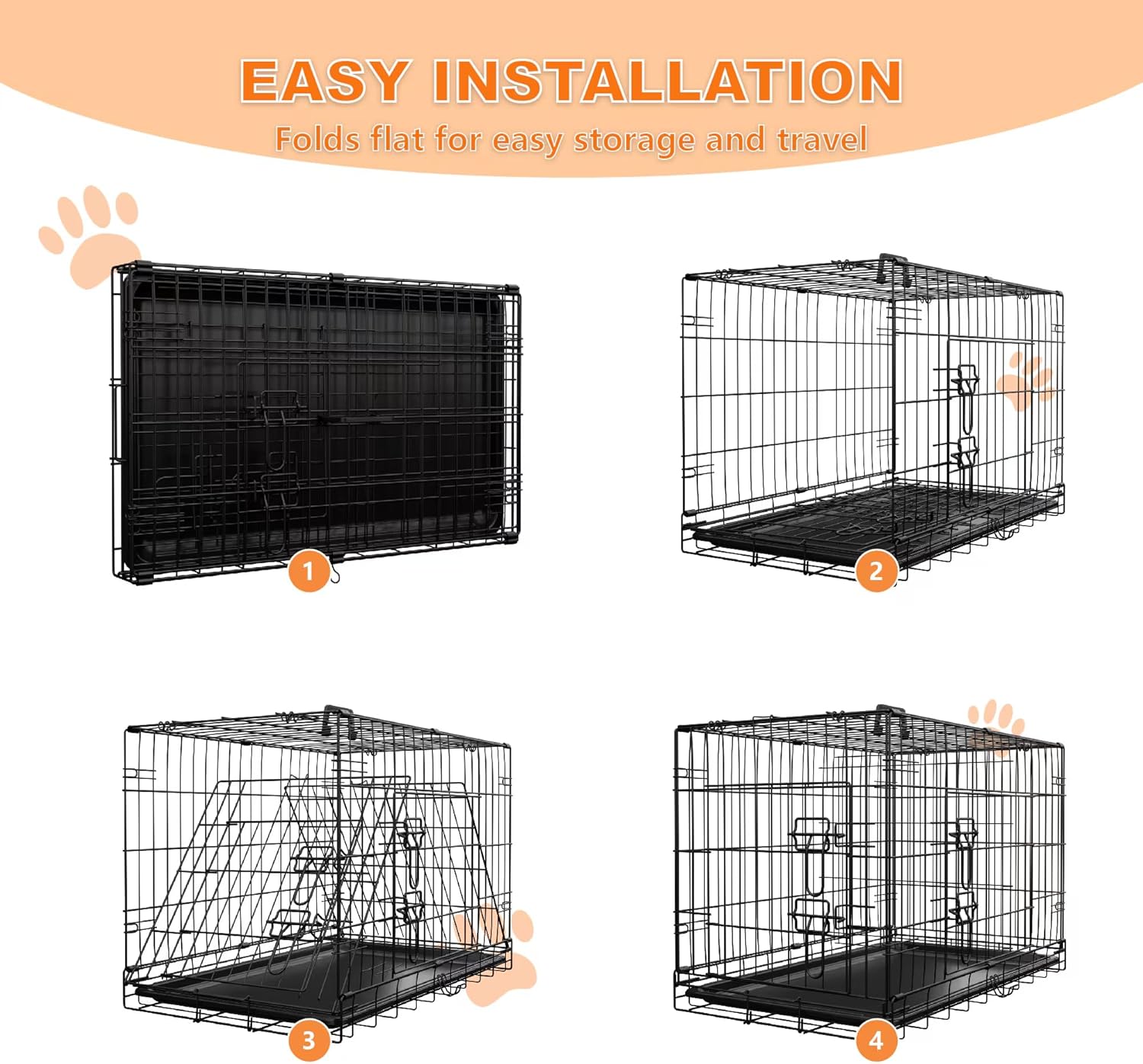 【Durable & Safe Construction】 Crafted from high-strength, rust-resistant metal with a protective black coating, this dog crate resists corrosion, fading, and wear. Every edge is smoothly finished for safety, ensuring no sharp corners—perfect for training, resting, or playtime.
