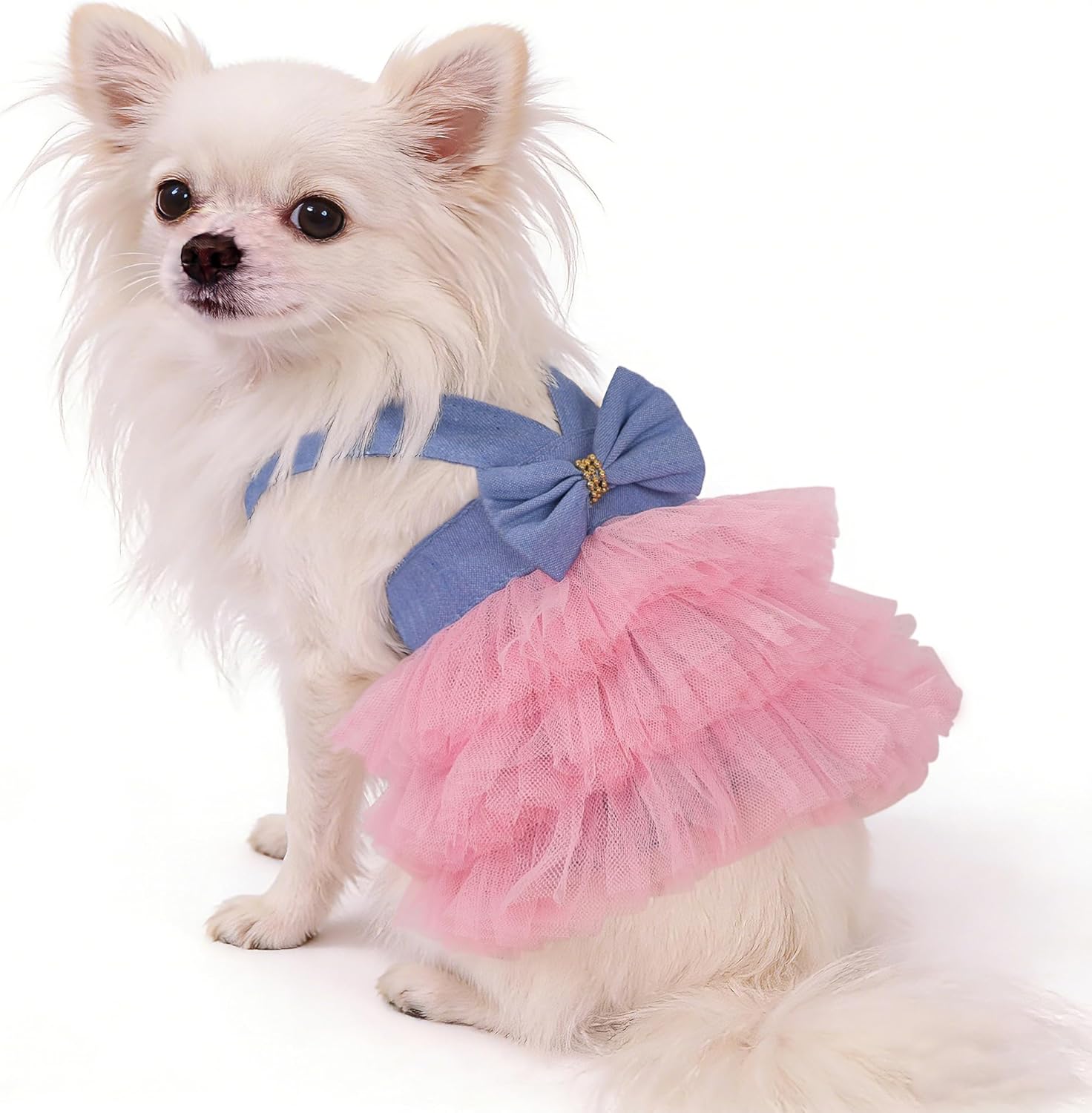 ćPREMIUM MATERIALćLightweight cotton denim fabric ideal for summer wear, with a breathable cross-back design. Multi-layered pink tulle creates a cute princess-style girl dog clothes that add charm and elegance to your pet’s wardrobe.