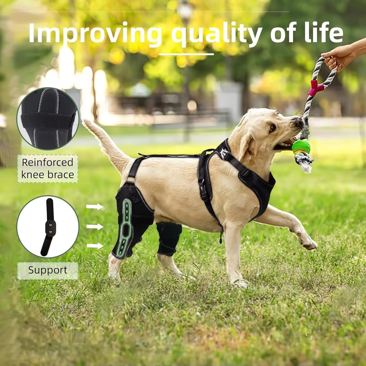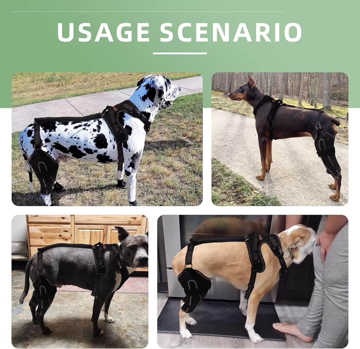 Unique Dog Knee Support Design: Innovative “chest and back integrated + leg wrap” suspension structure, the front chest strap and the hind leg pad are synchronously linked, and with adjustable Velcro, it is not only non-slip and firm, but also allows for free walking and playing, without fear of falling off.
