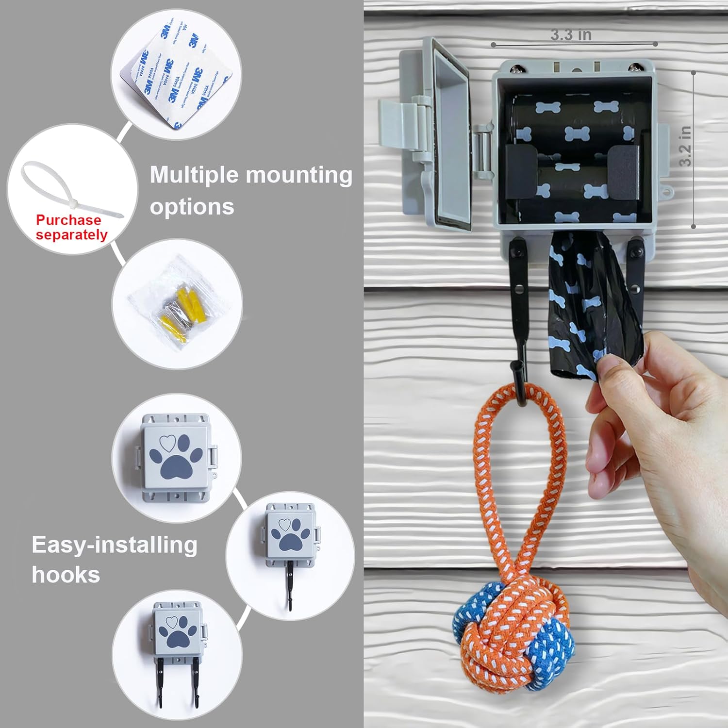 ć3 Mounting OptionsćStick on, screw on or strap on(you must order the ties seperately), the dog bag holder mini roll dispenser can be mounted at almost any place, indoor or outdoor, patio, front yard, backyard, garage, in the community, RV or apartment.