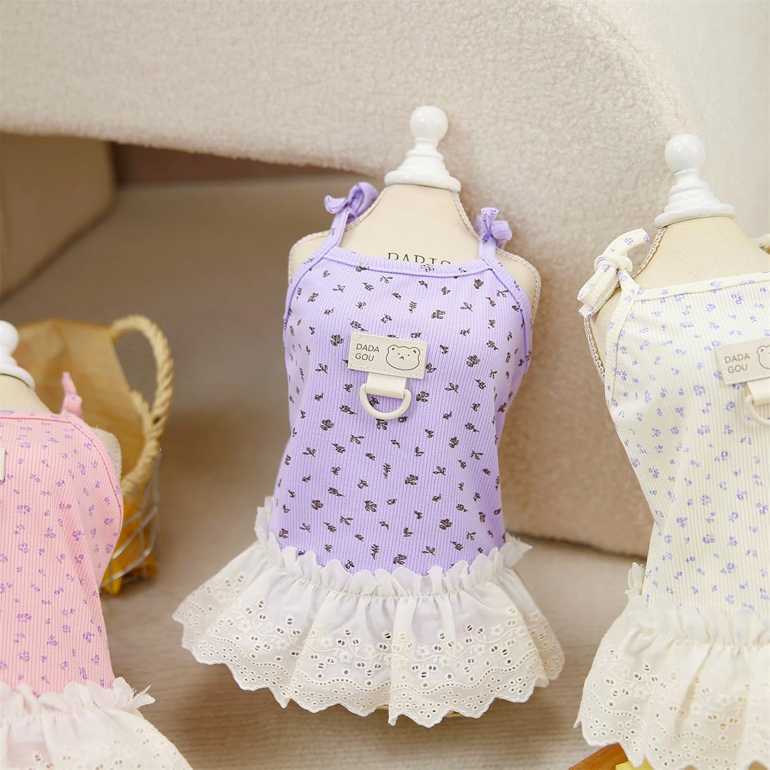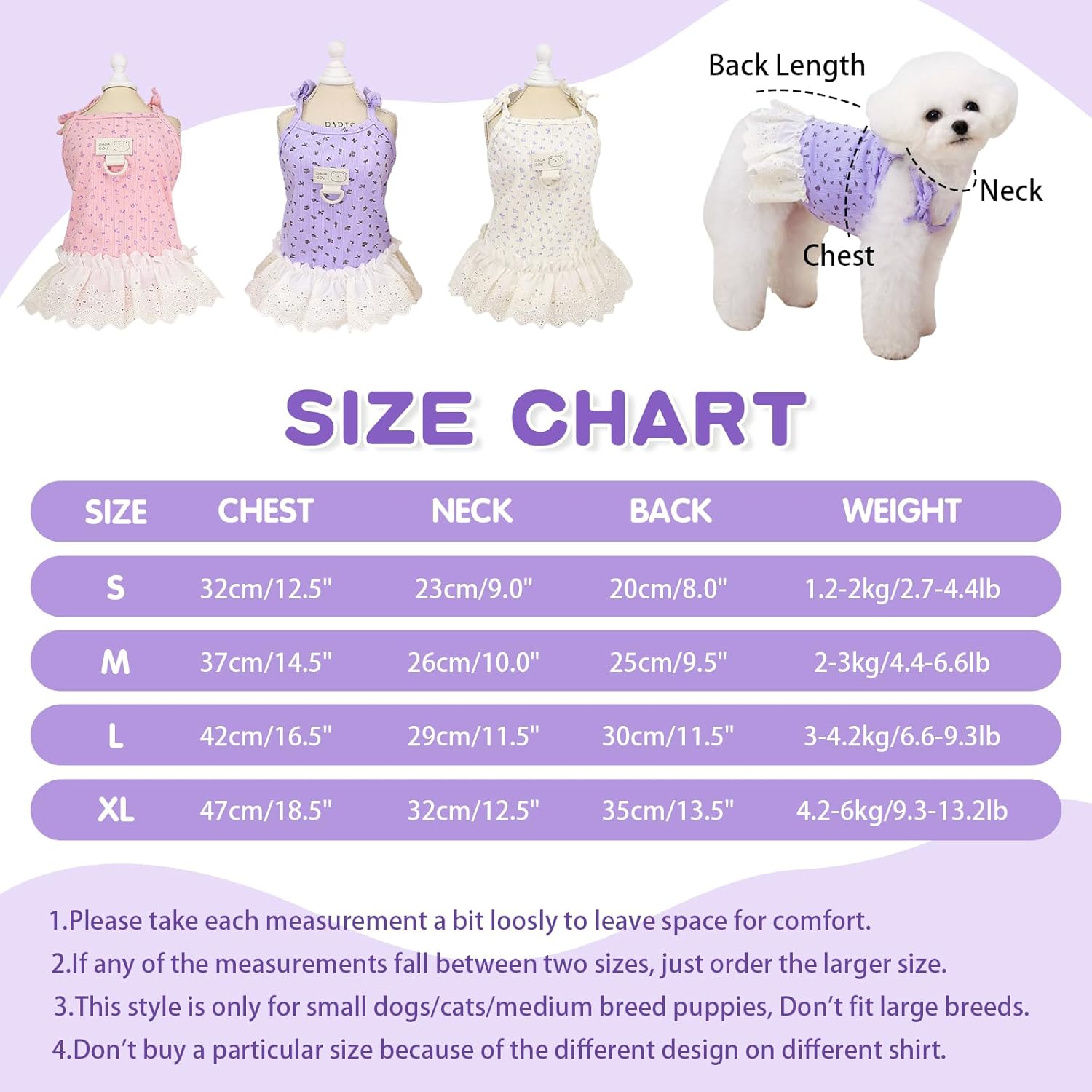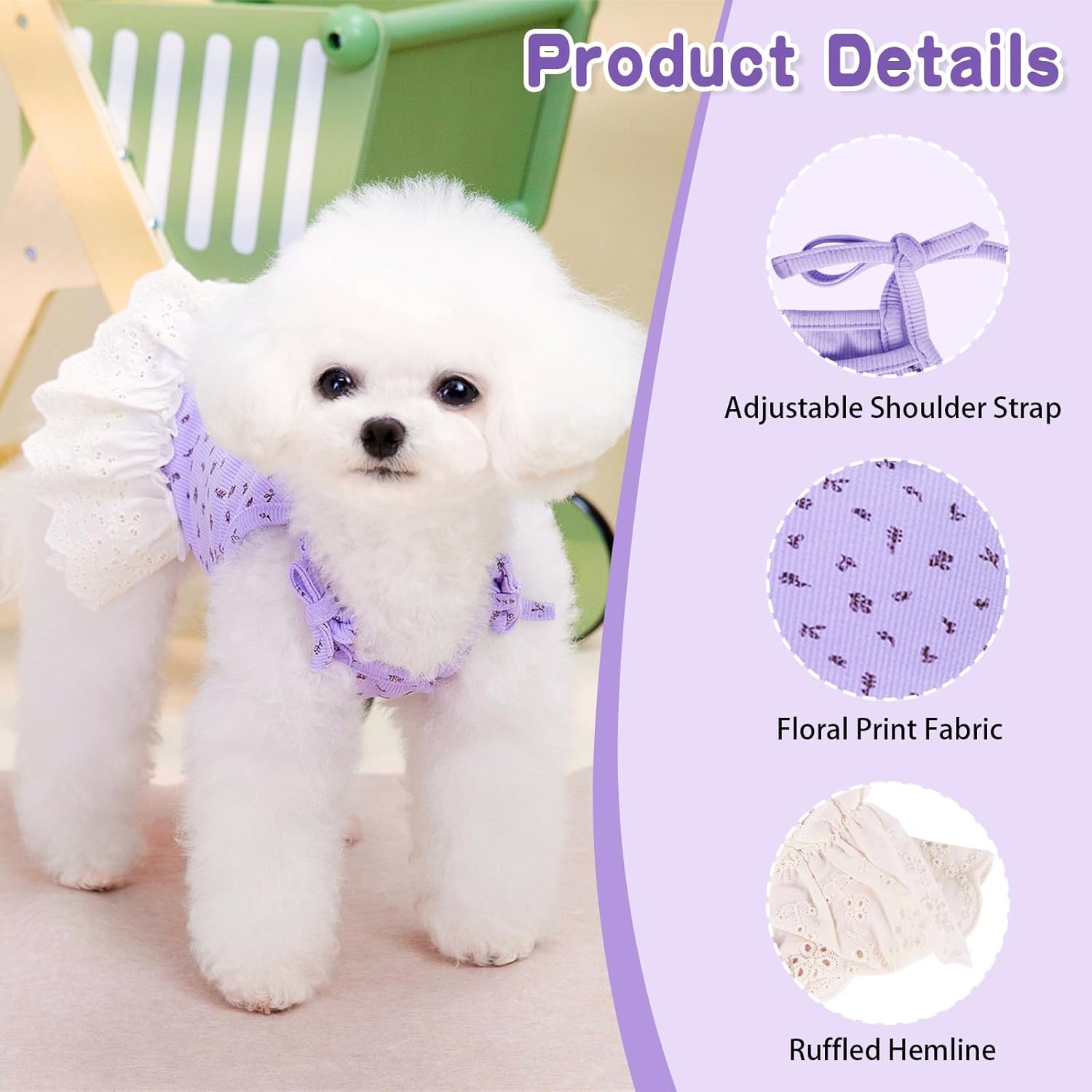 Stylish & Versatile:This dog summer clothes available in purple, pink, and cream, with delicate floral prints and delicate lace hems. Ideal for walks, parties, or photos. It’s a top choice among dog dresses for small dogs girl, making your pet stand out.