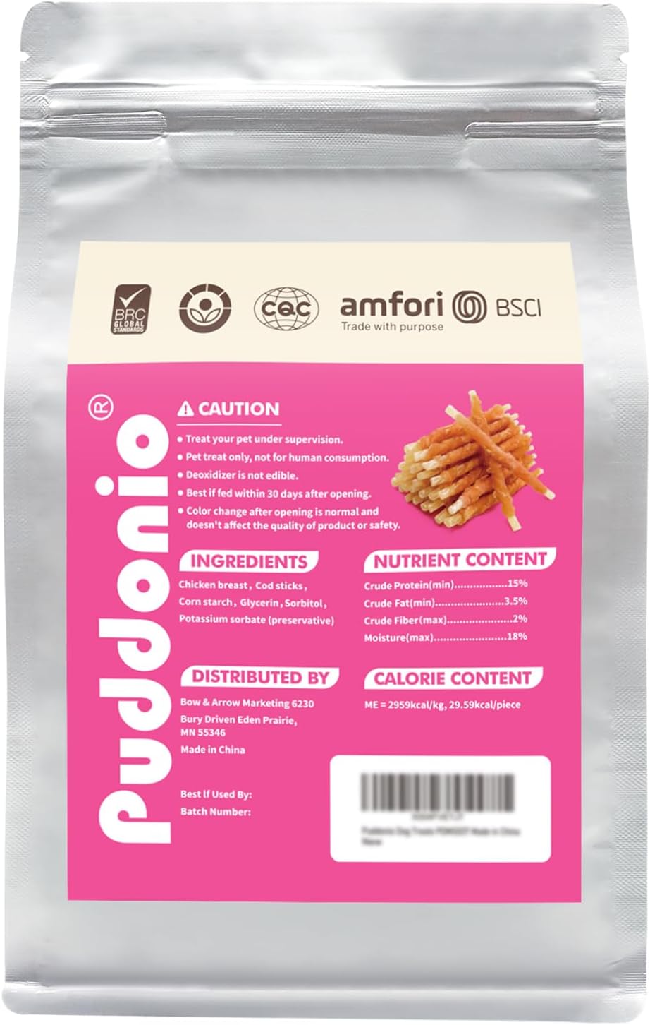 This is a review for Puddonio Dog Treats, Chicken Wrapped Cod Sticks, Rawhide Free Dog Training Treats, Healthy Soft Dog TreatsThe bag arrived and it didn’t disappoint, all the ingredients listed on the back looked great; Chicken breast, Cod Sticks, Corn Starch, Glycerin, Sorbitol and Potassium Sorbate (preservative). It was surprising to see so few ingredients and things you can not only pronounce but recognize too! These treats are also made with no added sugar and are low in fat and high in fiber. This bag is 8.82oz, one of those heavy duty, foil style bags that seem to keep the treats fresh for longer. The treats are made in China, appropriate for all stages and are listed as ‘treats for small dogs’.I hadn’t been confident when I ordered them that my dog would like them. But they looked good and had simple ingredients so I want to try them. She isn’t a huge fish fan, but I don’t think she even realized these were fish. Seems like a good way to sneak some extra omega 3s into their diet. My dog is a larger breed but she’s really good about not wolfing down treats. She basically snaps off one end then chews the rest in one bite. The manufacturer recommends 4-5 treats for dogs over 50 pounds and that was a good amount for my girl. I’ve been giving her 4 treats at once and she eats them in about 3 minutes! So for larger dogs these aren’t a “chew” but a nice little snack. For small breeds these should last a little longer. The treats aren’t rawhide so they won’t last a long time, but they’re a much healthier and safer alternative and should still keep your little pup busy for a bit.I’ve given my dog about 12 treats throughout this week and she’s had zero issues with her stomach. She can be sensitive to new treats but hasn’t had any gas or problems when going potty.Overall I’m really happy with the quality of the treats and how much my dog liked them. I think they’re a good value and I would definitely recommend them.Last, I want to say that I really appreciate how well the product page is set up. The treat’s ingredients, nutritional value, their size and feeding recommendations are all clearly shown in the main photos, graphics and product details. Most the time manufacturers only seem to highlight a few high quality ingredients on their page, then you have to hunt around in the fine print to find the 20 other ingredients used. Or you get the bag of treats only to find they’re teeny tiny when they were made to look like substantial chews in the photos. I found it so refreshing to have all the information up front before you order so you know exactly what you’re getting!