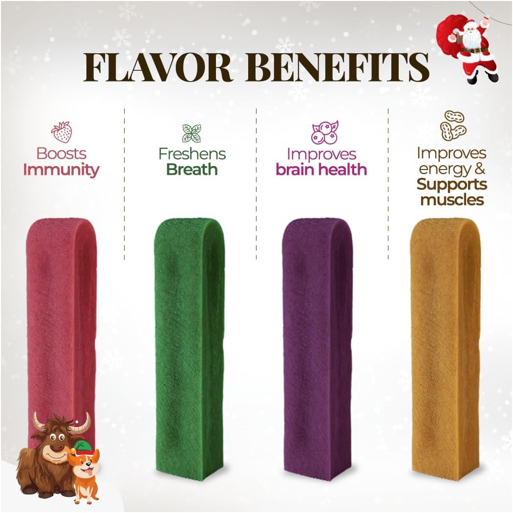 MULTIFLAVORED DENTAL CHEWS: Let your dog enjoy an assortment of flavored dental chews. Our Multiflavored Pack contains Strawberry, Blueberry, Peanut Butter & Mint flavored yak chews that dogs simply love.