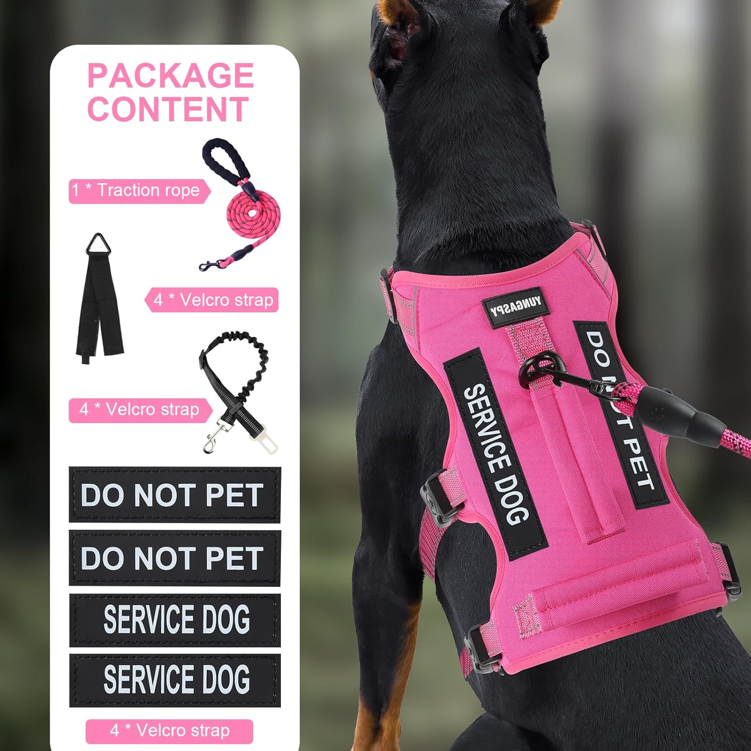 Made of high-quality fabrics, with two new Velcro strips on the back. The whole dog harness and leash set includes 1 * dog harness, 1 * dog leash, 1 * dog car seat belt, 2 * “SERVICE DOG” Removable Patches, 2 * “DO NOT PET” Removable Patches, and 1 * storage tape.