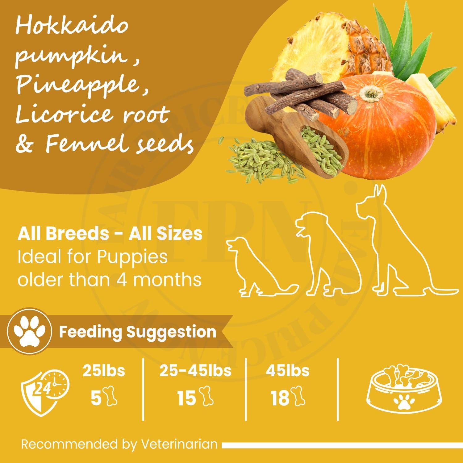 “FPN Vegan Dog Treats Combo Digention and Skin & Coat, Coconut Oil, Chia, Sesame & Sweet Potato, Grain-Free Biscuits, Plant-Based Ingredients, Suitable for All Breeds – 7 oz FPN Vegan Dog Treats are thoughtfully crafted to support your dog’s skin and coat health. Each 7 oz pouch contains grain-free biscuits made with coconut oil, chia, sesame, and sweet potato. These plant-based treats are free from artificial additives, making them a wholesome choice for your canine companion. Suitable for all breeds and sizes, these treats are recommended for dogs over 4 months old. These plant-based, oven-baked biscuits combine powerful superfoods like coconut oil, sesame seeds, chia, and sweet potato to deliver essential nutrients that help your dog shine—literally! Formulated for dogs with sensitivities, this treat skips the grains and animal products to offer a clean, hypoallergenic option. Omega-3s help reduce dryness and flaking, while anti-inflammatory turmeric and fiber-rich sweet potato promote smoother, more radiant skin and fur. Whether you’re training, treating, or simply showing your pup some love, FPN biscuits deliver both taste and health benefits in every bite.”