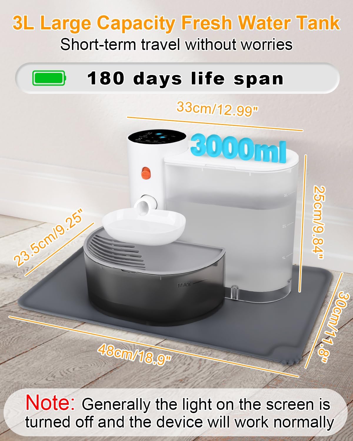 ćWarm TipsćThe silicone mat is in the gap between the small inner box and the outer box (on the left or right). Please check carefully!The maximum water will be dispensed within 3 hours is 120ml! Please choose according to the water demand of your pet.Usually suitable for families with no more than 3 adult cats,not for large dog.(If you notice any question or problem during use, please reach out immediately for troubleshooting support.Don’t worry)