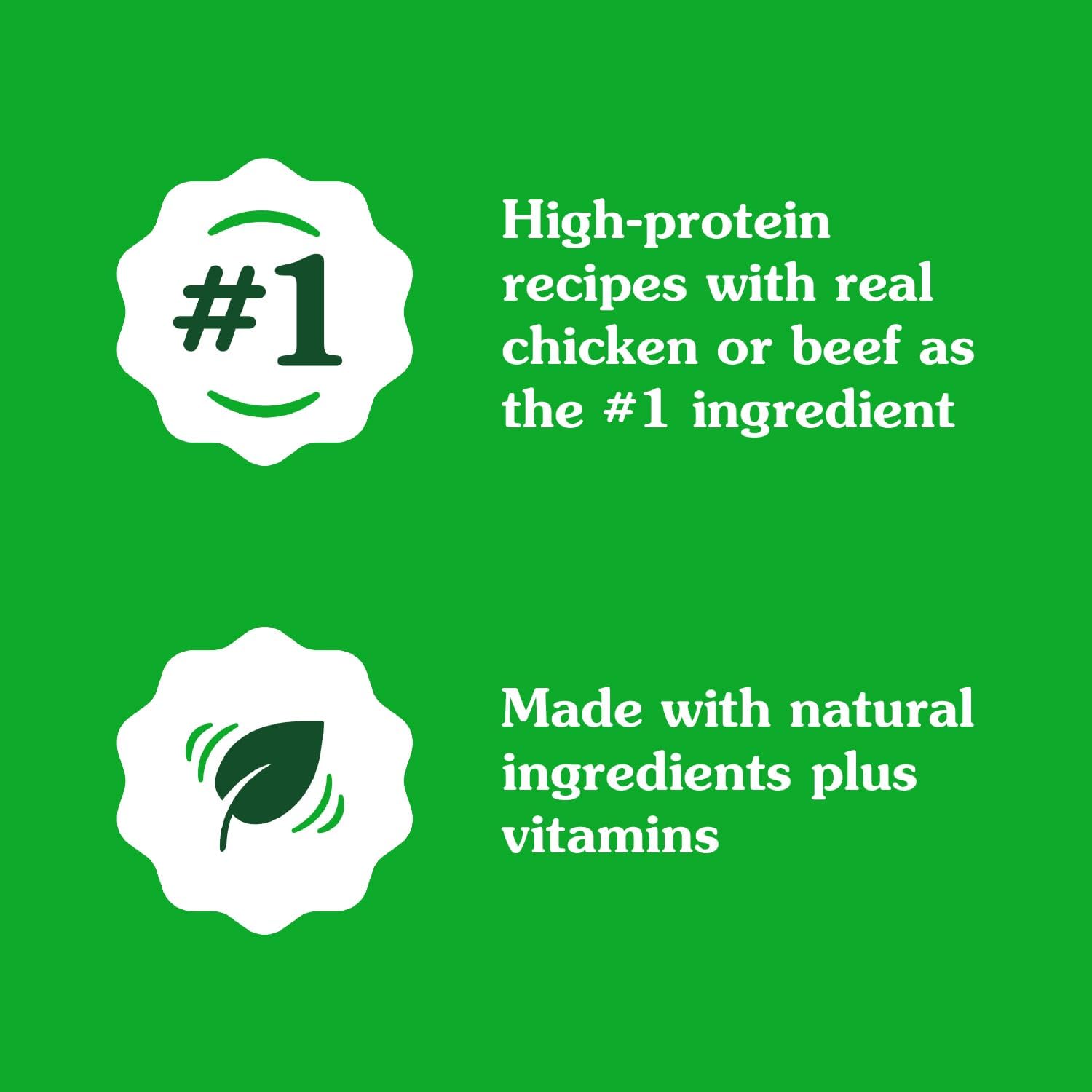 Naturally Delicious: With high-quality chicken or beef as the #1 ingredient and natural ingredients plus vitamins, these wet dog food complements add irresistible flavor to every bowl