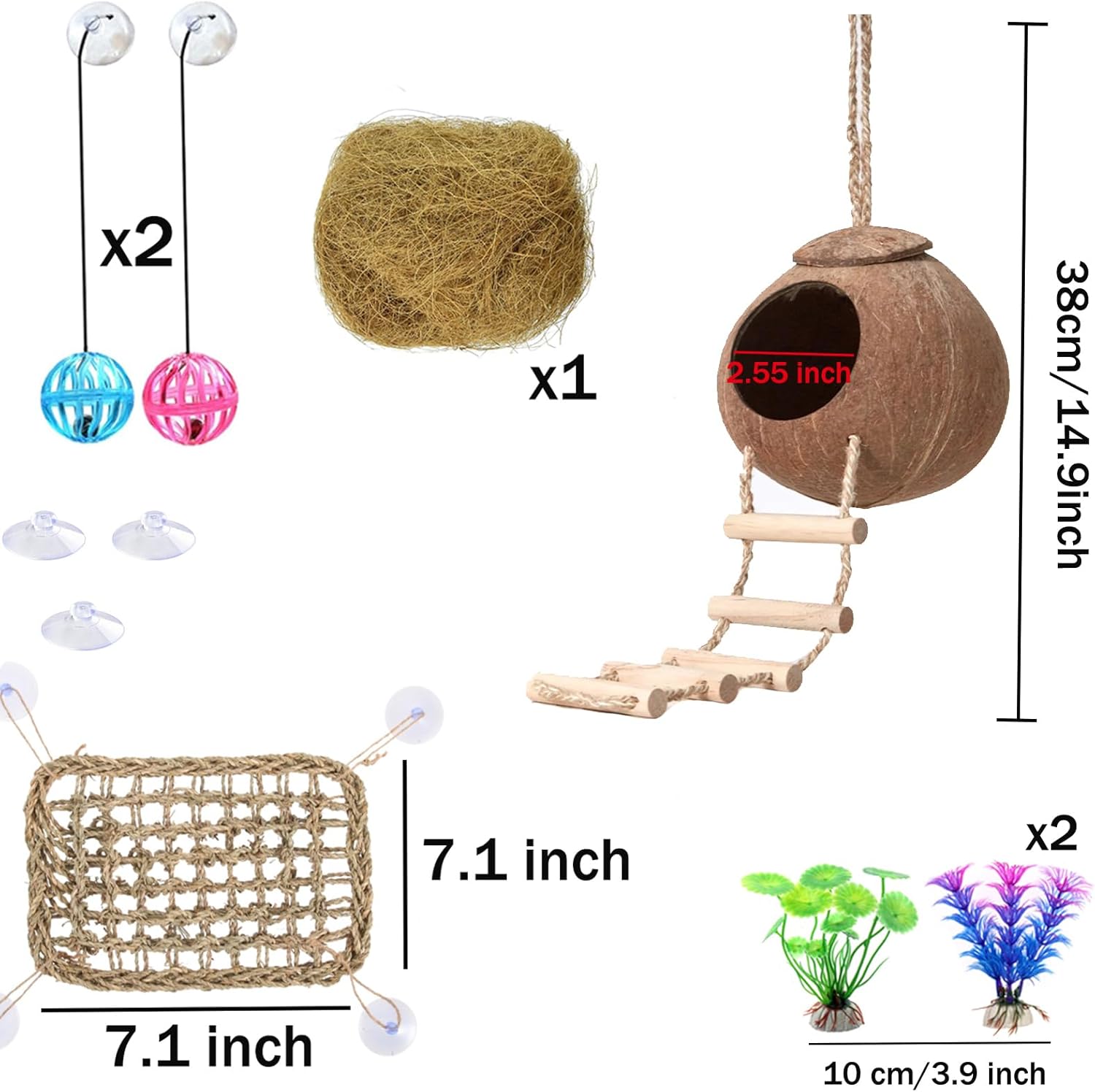Package include: Coconut house is made of 100% natural coconut, making it safe for pets. 14.9inch – 1x coconut house, 7.5ft – 1x coconut fiber, 2x Balls, 2x stand plant, 1x hammock, 1 x hanging plant.
