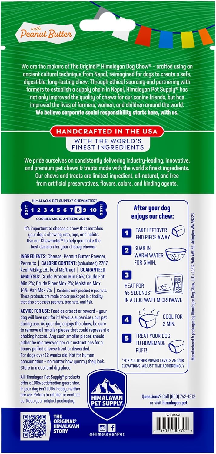 PEANUT BUTTER FLAVOR: Included is one medium, 2.3 oz peanut butter flavored Himalayan yak cheese stick – made using our traditional Himalayan cheese recipe, but with added bits of peanuts for more flavor! Ideal for dogs 35 pounds and smaller, not for dogs younger than 12 weeks.