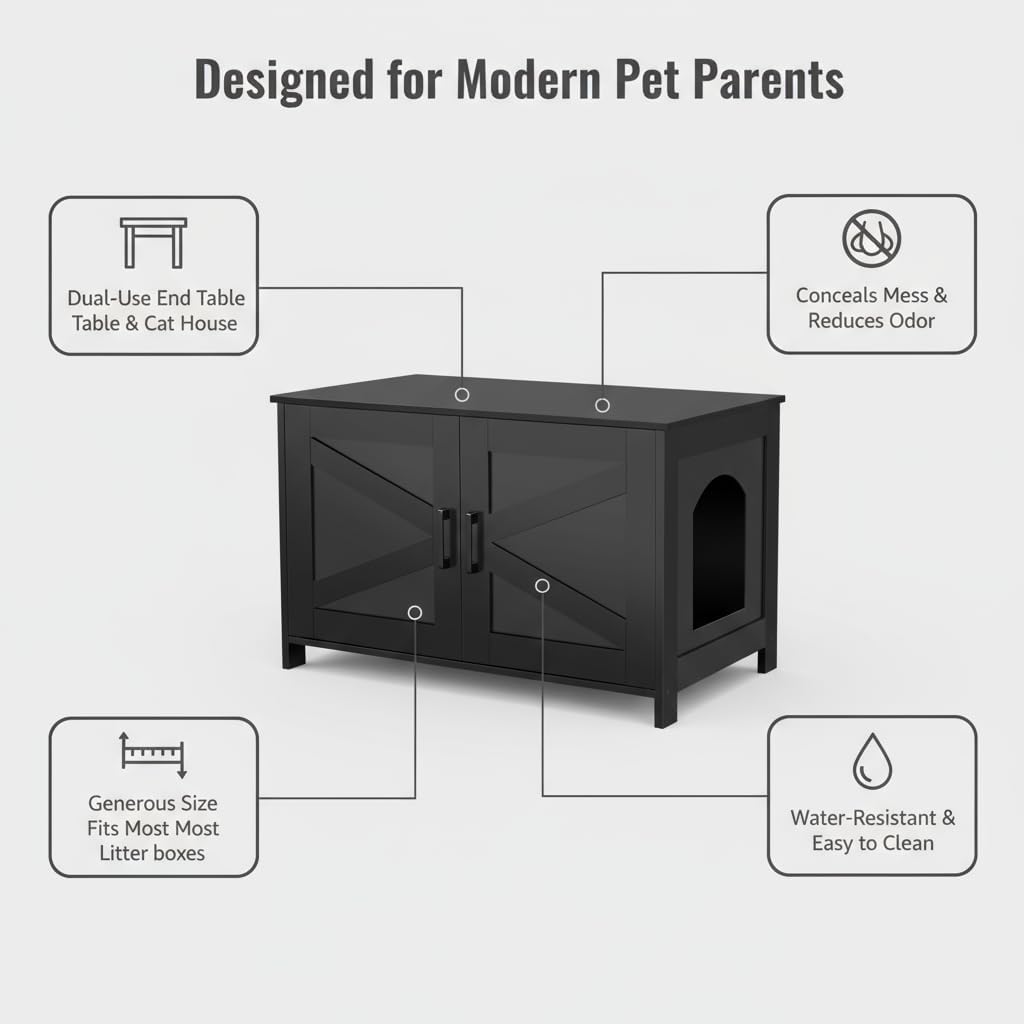 Fits Most Litter Boxes: Sized 31.5” L x 19.7” W x 19.7” H, The cat furniture is big enough for most of litter box and avoid litter scattering