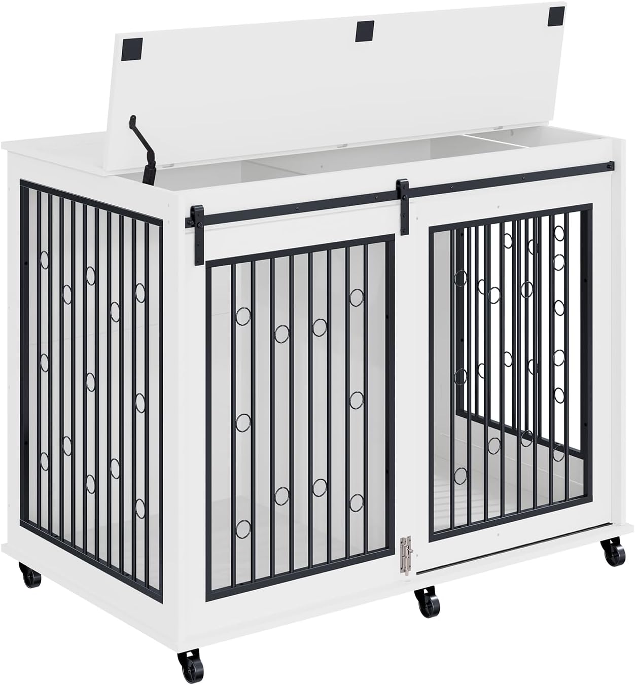 ćConvenient Double-Door AccessćFeaturing a sliding barn-style door on the front and a side door, this indoor dog kennel allows for easy entry and exit. Ideal for active dogs that enjoy moving around freely.