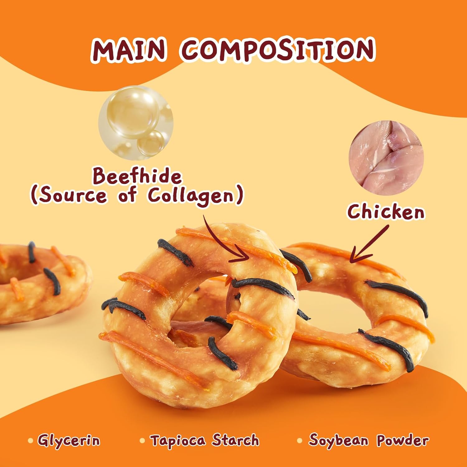 LONG LASTING DOG CHEWS: Our chicken wrapped collagen donuts are durable and long lasting, which encourage chewing and keep your dogs busy and satisfied, also relieve their pressure