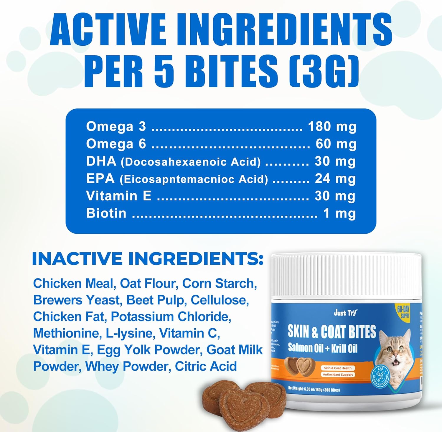 Just Try 6.35 oz Skin and Coat Bites Cat Vitamins for Indoor Cats Omega 3 for Cats Salmon Oil – Supports Healthy Skin Cat Itchy Skin Relief – 300 Bites