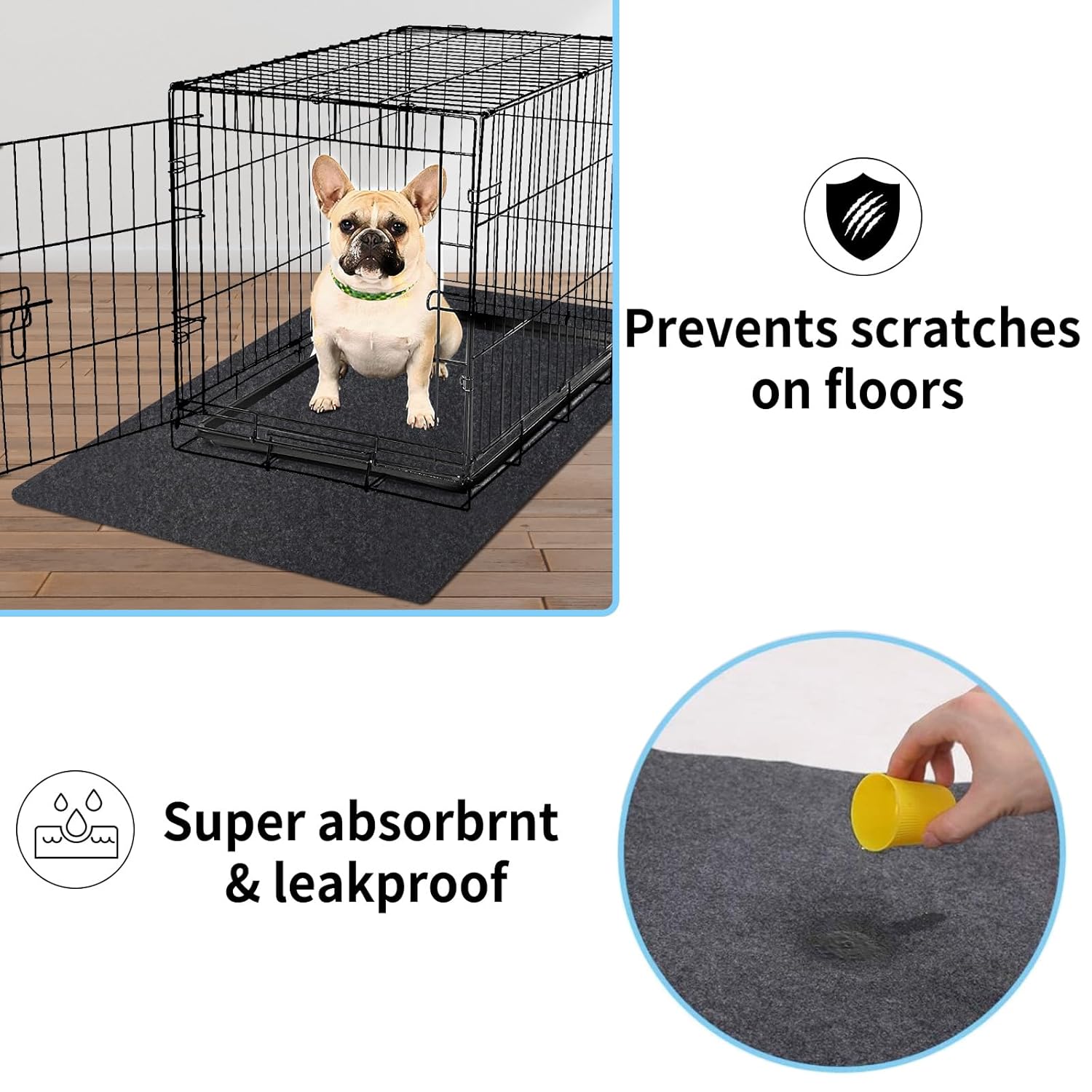 The pad fits perfectly under the crate, keeps the floor well protected, and does not slip around. It is waterproof, easy to clean, and very convenient to use. A great product that makes crate training much easier and keeps everything tidy.