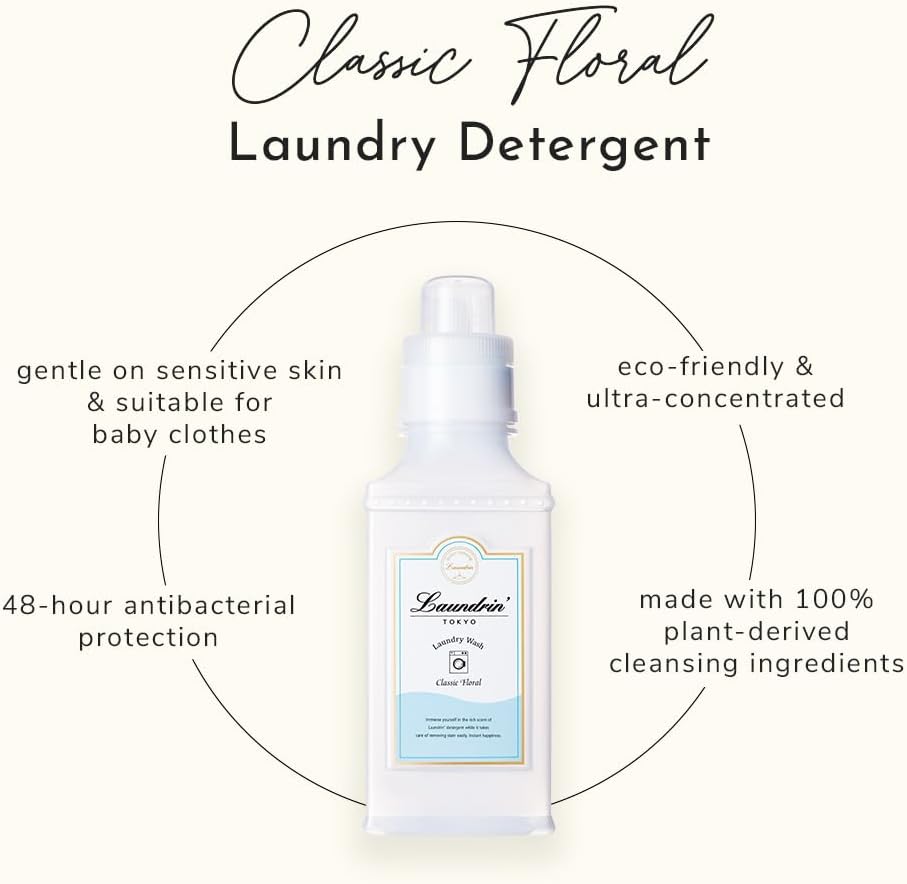 ULTRA-CONCENTRATED LAUNDRY DETERGENT – Laundrin Laundry Detergent Classic Floral is designed to offer a deep, effective clean with an elegant floral scent. This eco-friendly laundry soap detergent is gentle enough for sensitive skin and baby clothes while still powerful enough to remove tough stains.